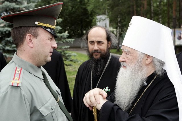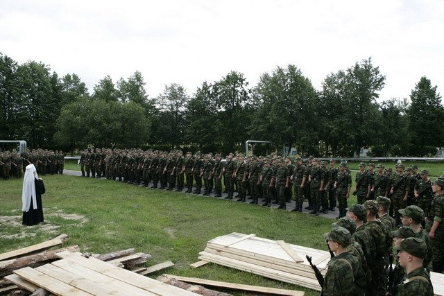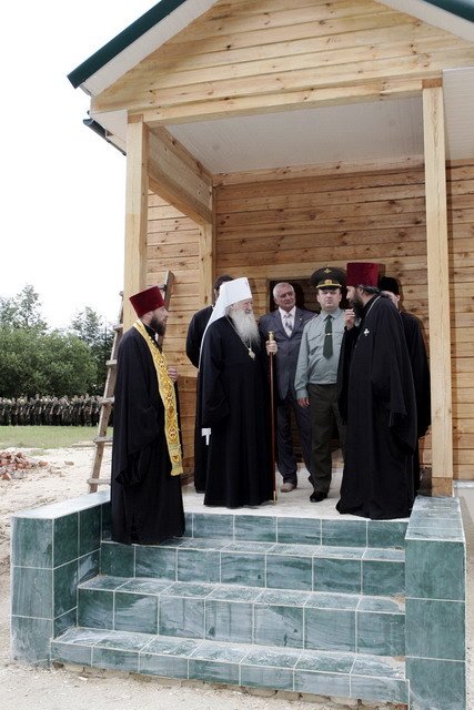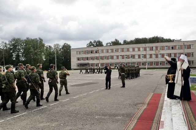 На 9 июля в учебном центре войск РХБЗ было запланировано крупное событие вручение воинского оружия новобранцам. Особо торжественный военный церемониал включил в себя и «чин благословения оружий», который совершил митрополит Ювеналий. Проникновенными и ясными, легко доходящими до сердца солдат, молитвами Владыка призвал Божие благословение на их службу по защите Родины. Несколько учебных батальонов прошли колонной перед командованием части и гостями, и Его Высокопреосвященство окропил воинов, сжимающих в своих руках только что полученные автоматы, святой водой. Поблагодарив митрополита за посещение, полковник С.П. Пастухов вручил Владыке медаль, посвященную