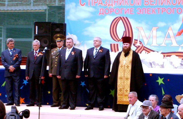 9 мая в г. Электрогорск прошли мероприятия, посвященные празднованию Дня Победы. В храме всех святых в земле Российской просиявших по окончании Божественной литургии настоятель священник Александр Мельничук совершил панихиду о усопших воинах и всех мученически отдавших свою жизнь в годы Великой Отечественной войны. К 12 часам дня у памятника погибшим воинам на площади у Дома культуры собралось много народа. Здесь были и ветераны войны, представители власти, и прихожане городского храма, и жители города, среди которых приятно было видеть молодое поколение. Празднование началось с торжественного шествия в котором участвовали трудовые коллективы предприятий, а также образовательных учреждений города. Для поздравительных слов на трибуну были приглашены глава города