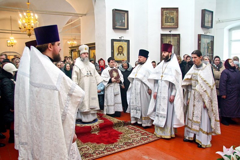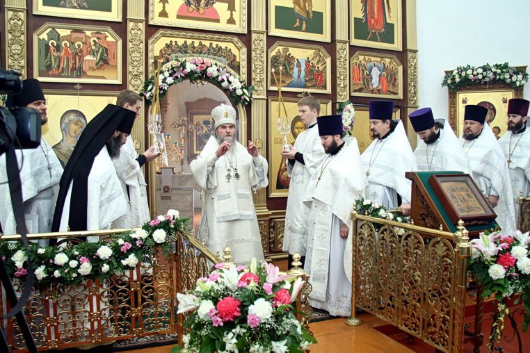 По окончании богослужения архиепископ Григорий поздравил прихожан с великим торжеством и передал благословение митрополита Ювеналия. Затем в благословение за усердные труды в деле восстановления Троицкого храма и приходской жизни Владыка вручил общецерковные награды: настоятелю храма протоиерею Андрею Коробкову — патриаршую грамоту, орденом благоверного князя Даниила Московского были отмечены: