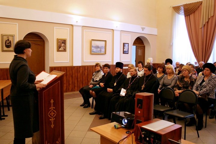 Далее все участники встречи переместились в актовый зал, где прошла основная часть мероприятия. Перед собравшимися с докладами, сообщениями и отзывами по преподаванию в школах и дошкольных учреждениях предметов «Духовное краеведение Подмосковья», «Основы православной культуры», «Основные религии России» и других