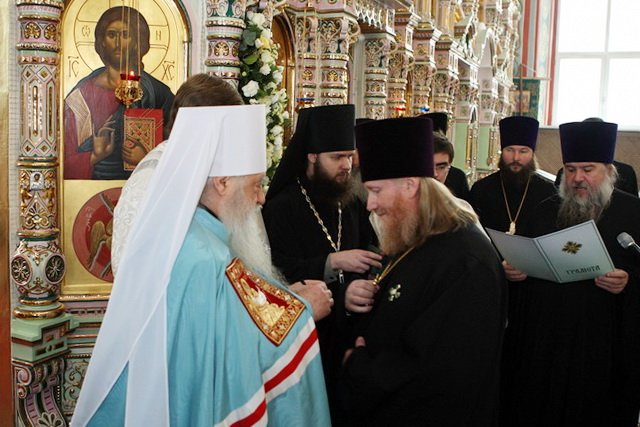 Святейший Патриарх, по моему представлению, удостоил жертвователей этого храма первосвятительскими наградами. Я со своей стороны, тоже хотел бы отметить архиерейскими наградами многих и многих. Но сегодня была долгая служба, я не хочу утомлять всех, чтобы в течение долгого времени мы проводили награждение каждого в отдельности. Сегодня будет праздничный прием, и на нем я вручу свои награды. Но награды Первосвятителя, Святейшего Патриарха Кирилла, я считаю своим долгом передать в данный момент и прошу отца Александра Ганабу, нашего епархиального секретаря, огласить имена награждаемых.