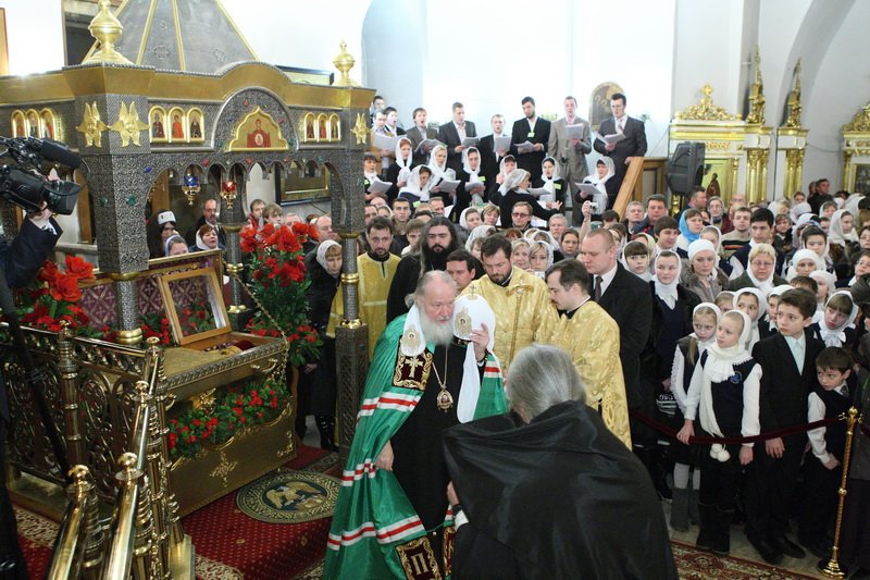 Перед началом Литургии Святейший Патриарх приложился к мощам священномученика Константина Богородского, который был настоятелем собора на протяжении 23 лет — в 1918 г. отца Константина замучили большевики, в 2000 г. он был прославлен для общецерковного почитания, и с 2004 г. его честные мощи находятся в Богоявленском соборе.