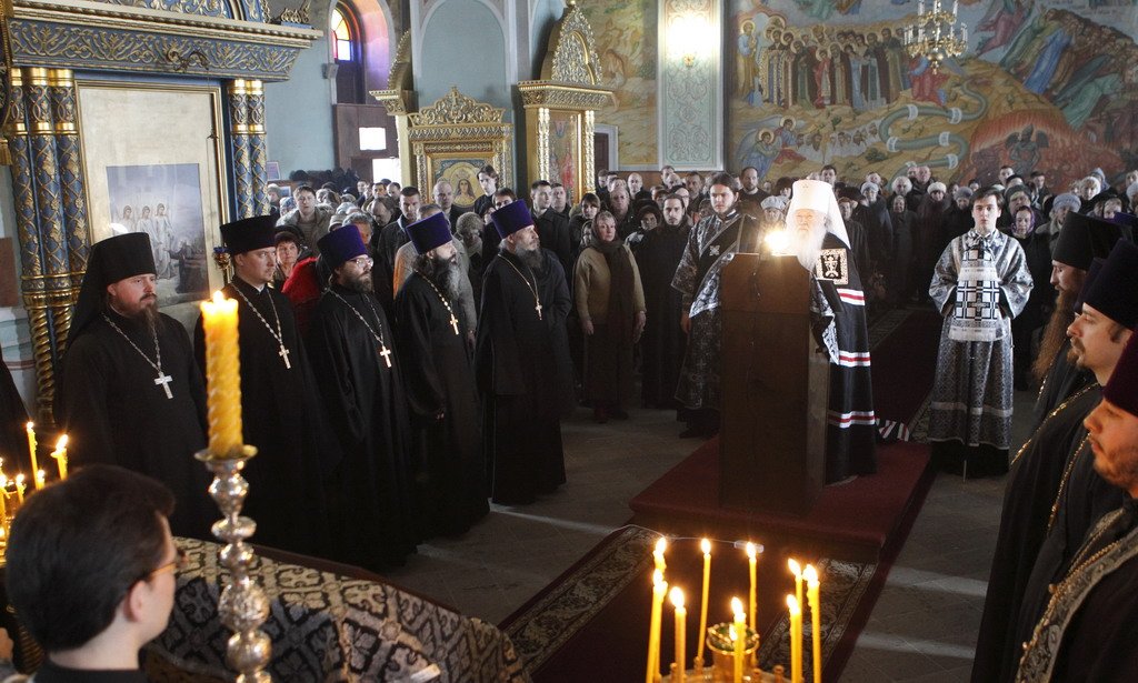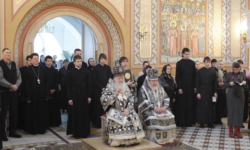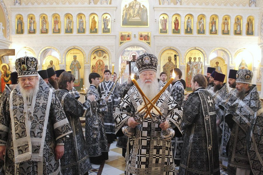 Вечером, в 17 часов, в Тихвинском храме на Соборной площади митрополит Ювеналий совершил положенное в этот день по уставу великое повечерие, за которым читал Великий покаянный канон преподобного Андрея Критского.