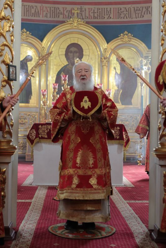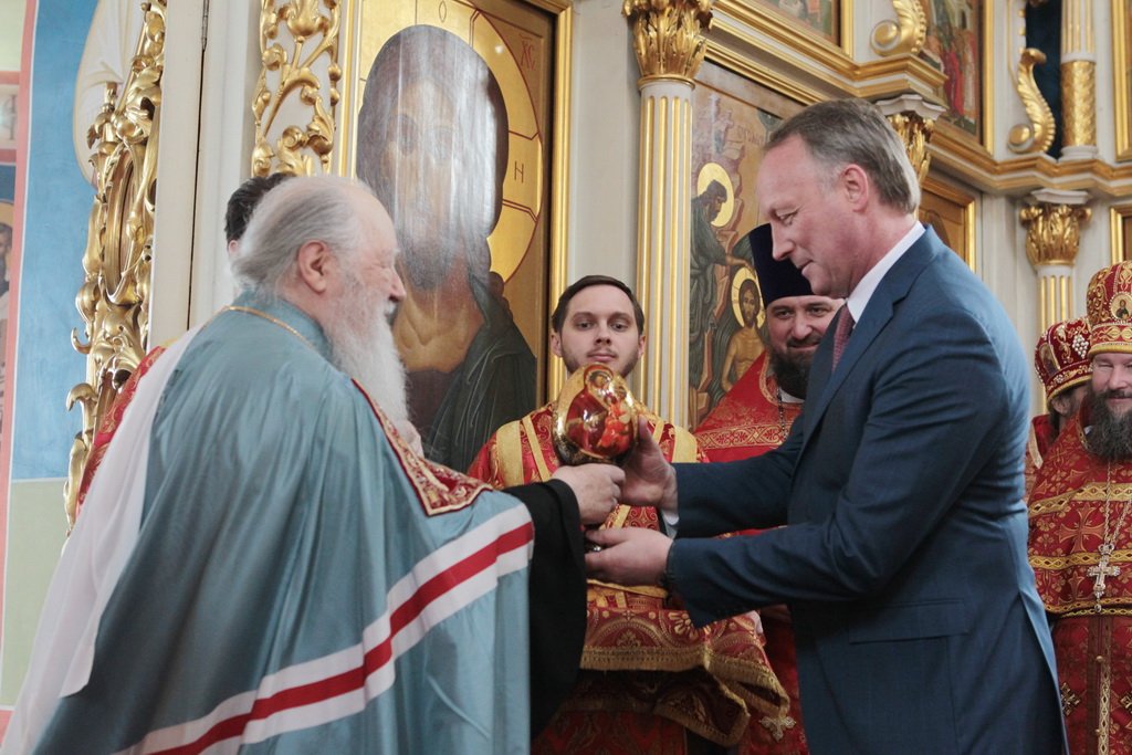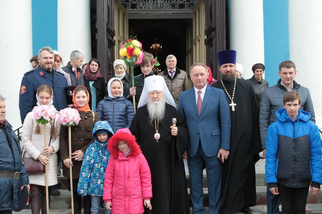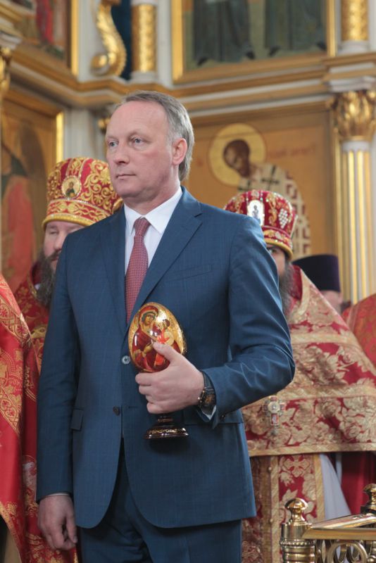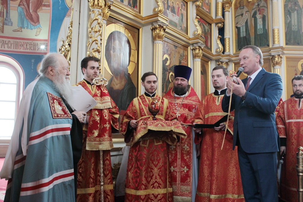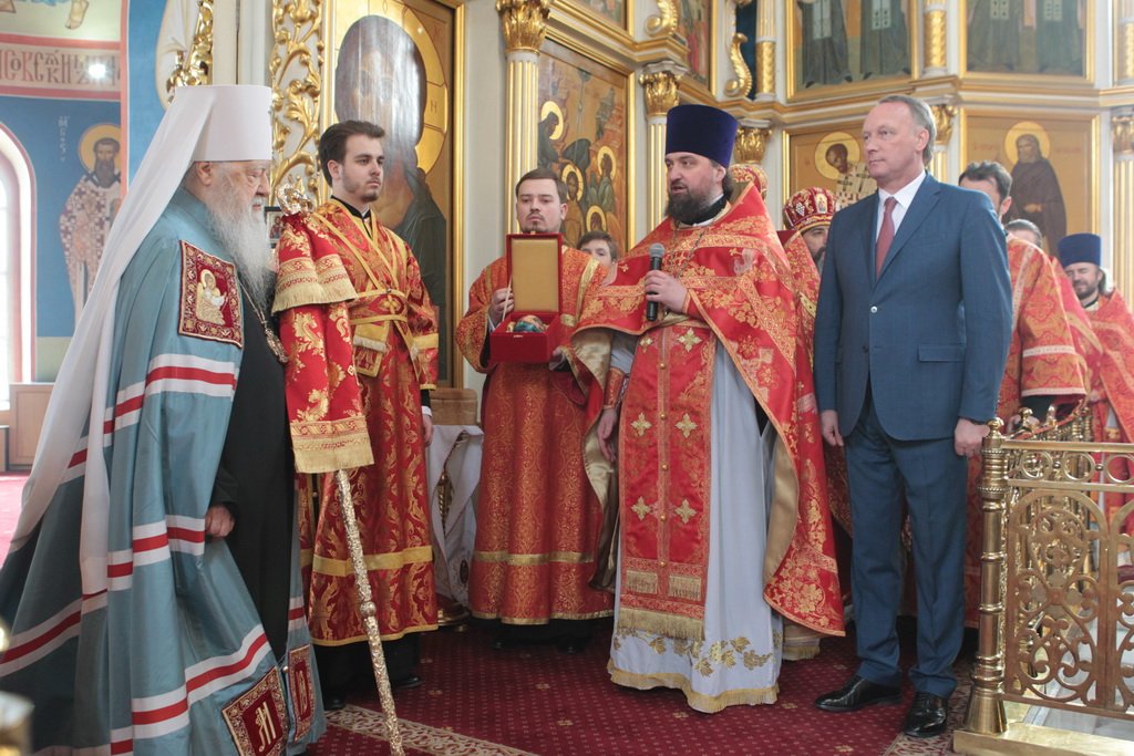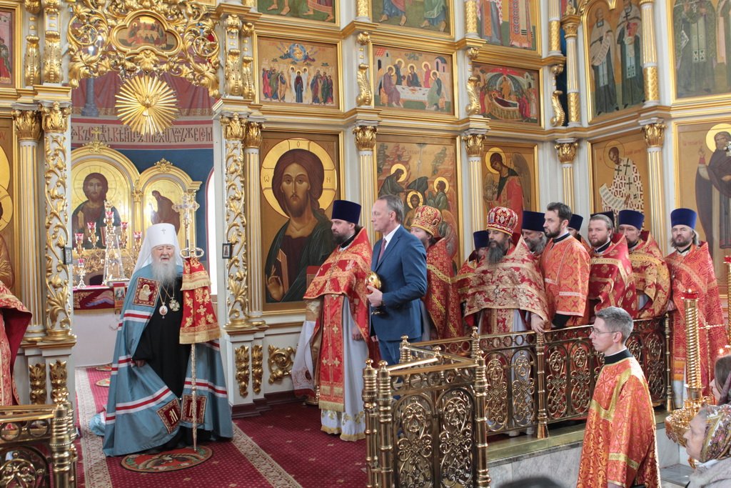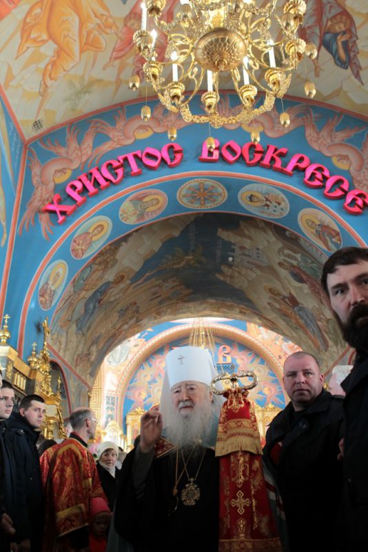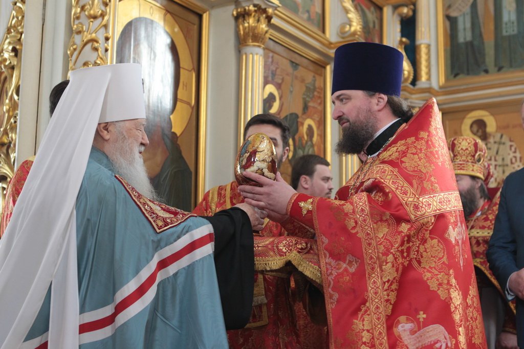 Затем митрополит Ювеналий обратился к духовенству и молящимся с архипастырским словом: «Дорогой отец Марк, уважаемый Игорь Петрович, всечестные отцы, дорогие и возлюбленные братья и сестры! Христос Воскресе! В этот день нет других слов, которые бы выражали и суть праздника, и глубокую радость. Воскресение Христово, которое воспринимается верующим сердцем, преобразует жизнь человека, и он уже не думает о смерти, как о прекращении своей жизни, но готовится к ней, как к переходу в жизнь вечную. Своим Воскресением Христос убедил нас в этой будущей жизни. И Сам, еще до Своих страданий, Он воскресил из мертвых Лазаря, который четыре дня уже был погребен (см.: Ин. 11:1–46), и тем самым уверил в будущем воскресении всех нас. А как нам праздновать Пасху? Мы должны, возлюбленные братья и сестры, вспоминать не только страдания Христовы, но и Его учение, которое запечатлено четырьмя евангелистами: Матфеем, Марком, Лукой и Иоанном, которые были живыми свидетелями того, что говорил Христос. Мы должны вникать в эти вечные страницы Евангельского учения и стремиться воплощать его в жизнь. Господь заповедал нам мир, Господь заповедал нам любить друг друга, служить друг другу до самопожертвования, быть милосердными (см.: Ин. 14:27; 13:34). И мы по силе человеческой возможности, с Божией помощью, стремимся это исполнять. Но слаб бывает человек и не исполняет заповедей Божиих. Однако у нас есть примеры того, как Христос относился к грешникам: Он милосерд, и Церковь в Таинстве Покаяния именем Божиим через священника прощает кающихся. И они, очищенные покаянием, причащением Святых Христовых Таин, получают новую силу для того, чтобы жить благочестиво. Я счастлив, что вижу вас во множестве в этом соборе. Рад, что этот собор благоукрашен. Помню, в каком тяжелом состоянии он был передан нам. И мы здесь, среди храма, устанавливали престол и служили первые Литургии. Но самое дорогое для нас — это верующие люди. Я сегодня до глубины души растроган, что вижу множество детей, которые активно участвуют в жизни Церкви, поют на клиросе, причащаются Святых Христовых Таин, учатся здесь, постигая православное учение. Я от души благодарю отца Марка за его приветствие, и Вас, уважаемый Игорь Петрович, и всех, кто с Вами сегодня присутствует здесь. Я радуюсь, что настало мирное время для нашего Отечества и свобода для Церкви Христовой, которая невозбранно осуществляет свою духовную миссию, просветительскую и социальную работу. От души желаю всем вам Божиего благословения, здоровья, счастья, благополучия. Пусть Господь хранит всех вас на многая и благая лета. Христос Воскресе! Воистину Воскресе!»