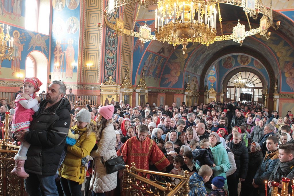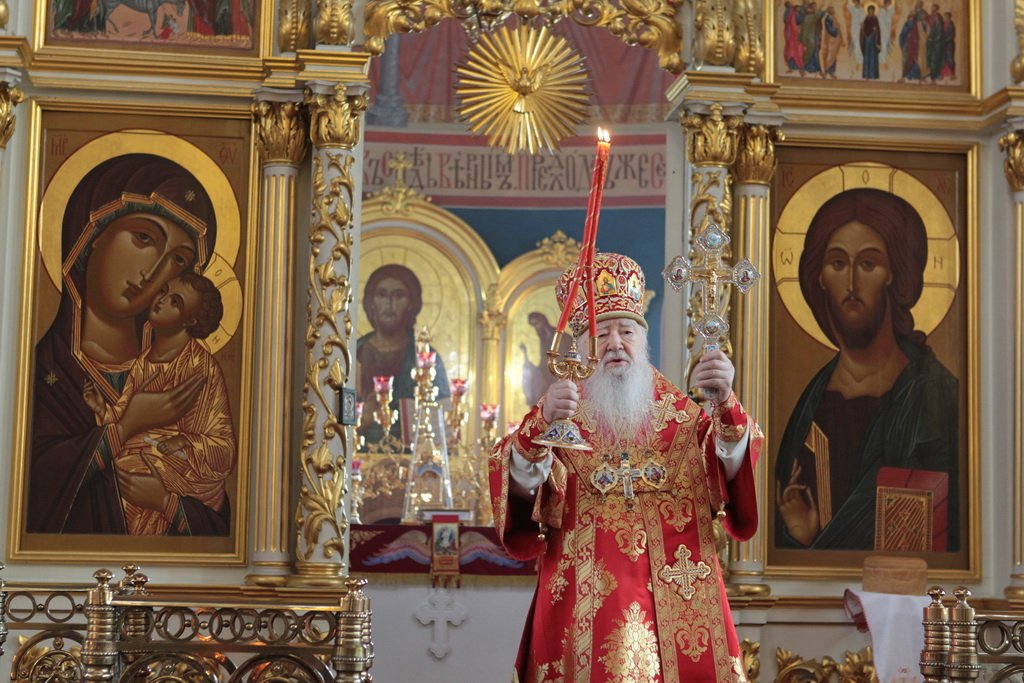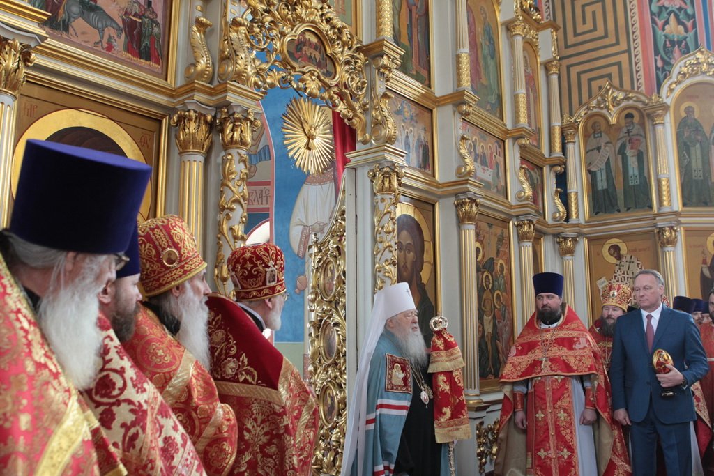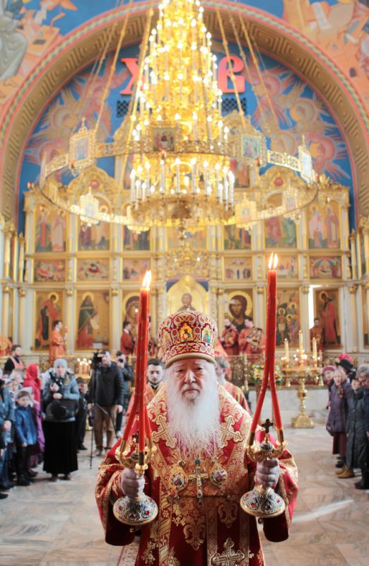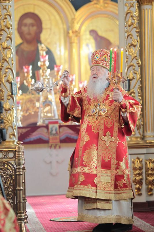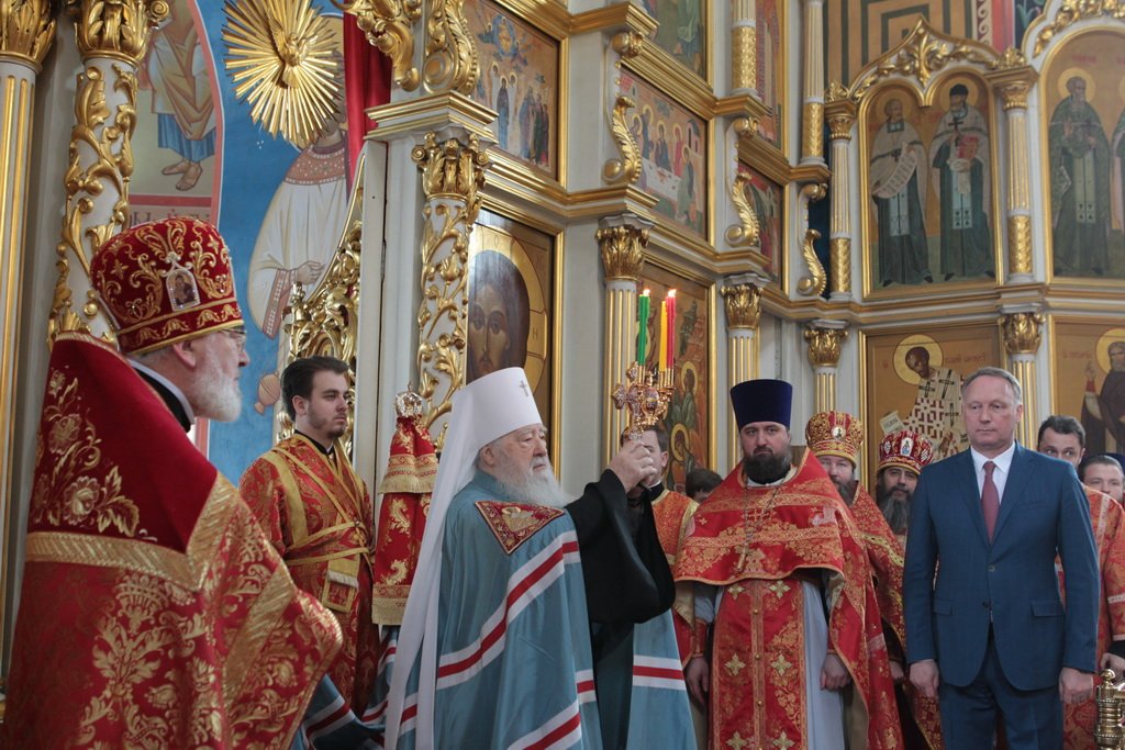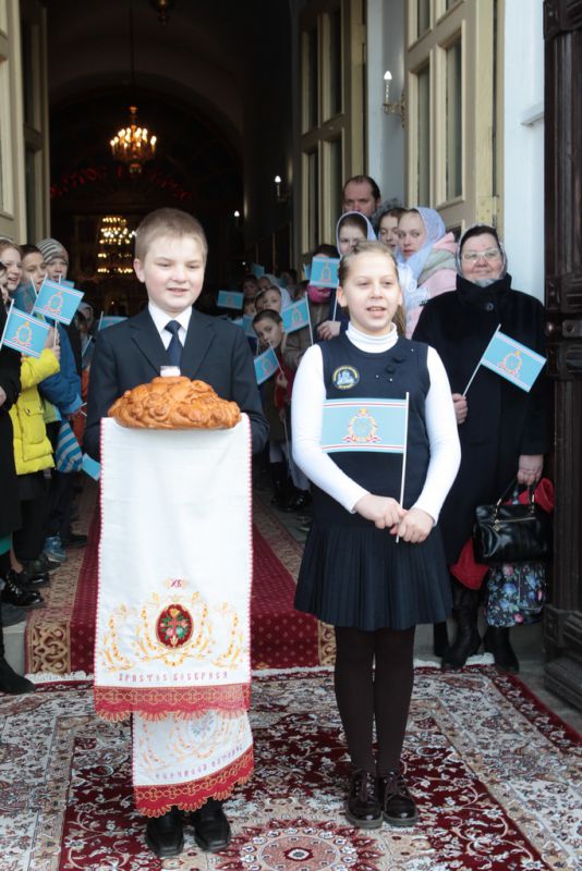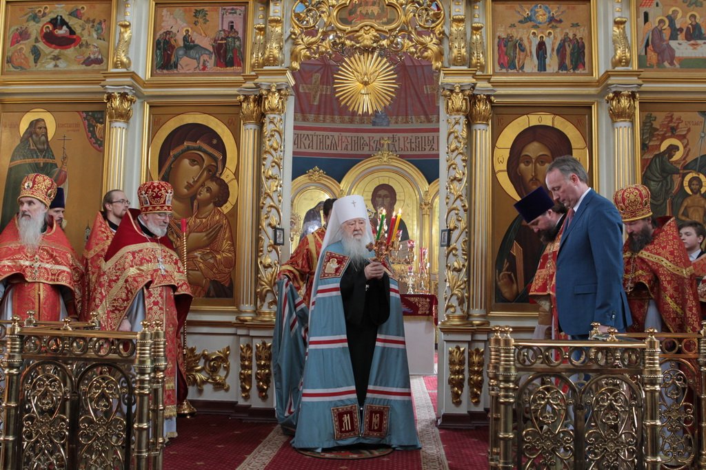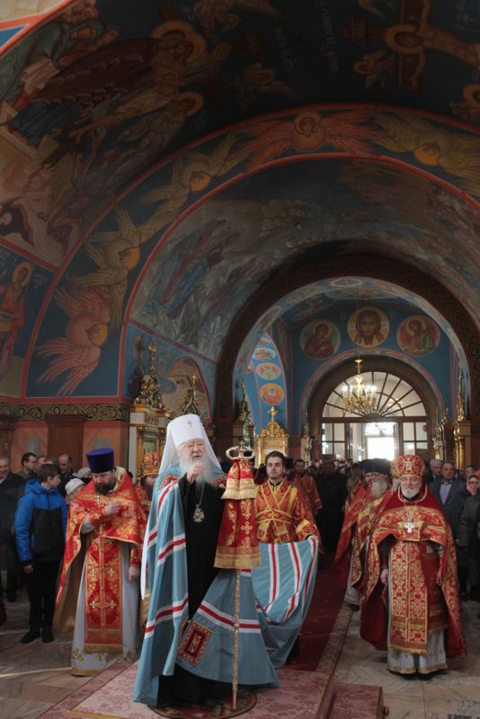 Затем митрополит Ювеналий обратился к духовенству и молящимся с архипастырским словом: «Дорогой отец Марк, уважаемый Игорь Петрович, всечестные отцы, дорогие и возлюбленные братья и сестры! Христос Воскресе! В этот день нет других слов, которые бы выражали и суть праздника, и глубокую радость. Воскресение Христово, которое воспринимается верующим сердцем, преобразует жизнь человека, и он уже не думает о смерти, как о прекращении своей жизни, но готовится к ней, как к переходу в жизнь вечную. Своим Воскресением Христос убедил нас в этой будущей жизни. И Сам, еще до Своих страданий, Он воскресил из мертвых Лазаря, который четыре дня уже был погребен (см.: Ин. 11:1–46), и тем самым уверил в будущем воскресении всех нас. А как нам праздновать Пасху? Мы должны, возлюбленные братья и сестры, вспоминать не только страдания Христовы, но и Его учение, которое запечатлено четырьмя евангелистами: Матфеем, Марком, Лукой и Иоанном, которые были живыми свидетелями того, что говорил Христос. Мы должны вникать в эти вечные страницы Евангельского учения и стремиться воплощать его в жизнь. Господь заповедал нам мир, Господь заповедал нам любить друг друга, служить друг другу до самопожертвования, быть милосердными (см.: Ин. 14:27; 13:34). И мы по силе человеческой возможности, с Божией помощью, стремимся это исполнять. Но слаб бывает человек и не исполняет заповедей Божиих. Однако у нас есть примеры того, как Христос относился к грешникам: Он милосерд, и Церковь в Таинстве Покаяния именем Божиим через священника прощает кающихся. И они, очищенные покаянием, причащением Святых Христовых Таин, получают новую силу для того, чтобы жить благочестиво. Я счастлив, что вижу вас во множестве в этом соборе. Рад, что этот собор благоукрашен. Помню, в каком тяжелом состоянии он был передан нам. И мы здесь, среди храма, устанавливали престол и служили первые Литургии. Но самое дорогое для нас — это верующие люди. Я сегодня до глубины души растроган, что вижу множество детей, которые активно участвуют в жизни Церкви, поют на клиросе, причащаются Святых Христовых Таин, учатся здесь, постигая православное учение. Я от души благодарю отца Марка за его приветствие, и Вас, уважаемый Игорь Петрович, и всех, кто с Вами сегодня присутствует здесь. Я радуюсь, что настало мирное время для нашего Отечества и свобода для Церкви Христовой, которая невозбранно осуществляет свою духовную миссию, просветительскую и социальную работу. От души желаю всем вам Божиего благословения, здоровья, счастья, благополучия. Пусть Господь хранит всех вас на многая и благая лета. Христос Воскресе! Воистину Воскресе!»