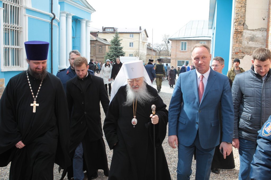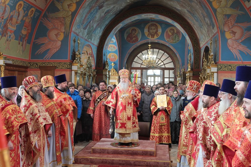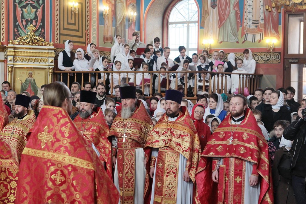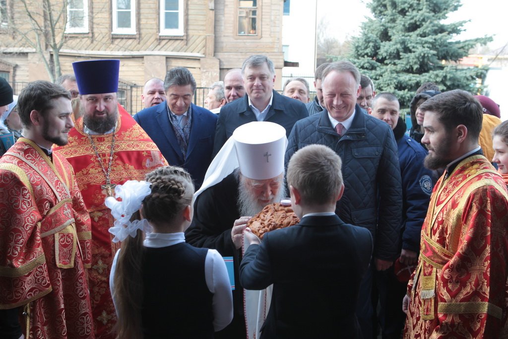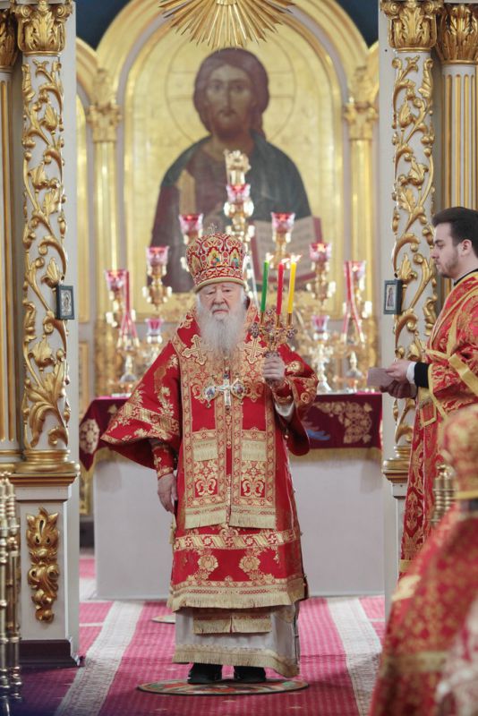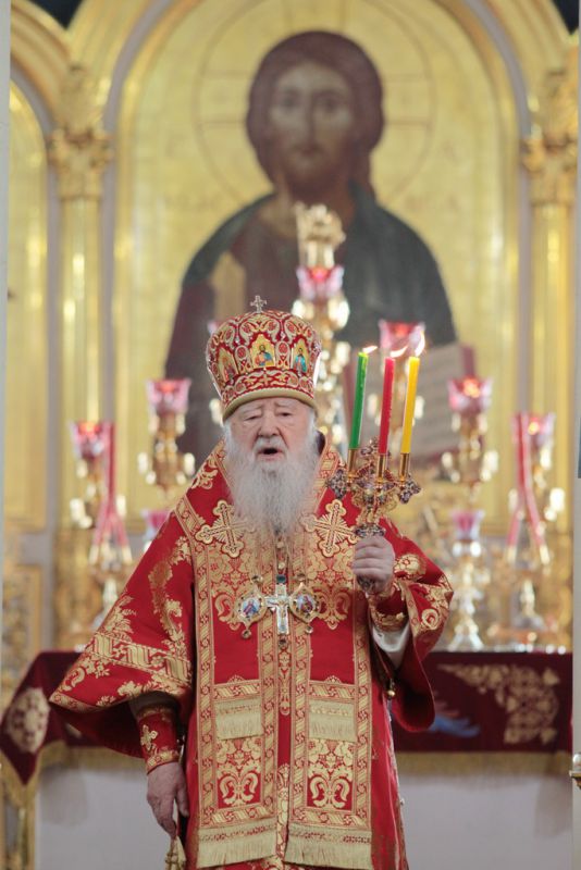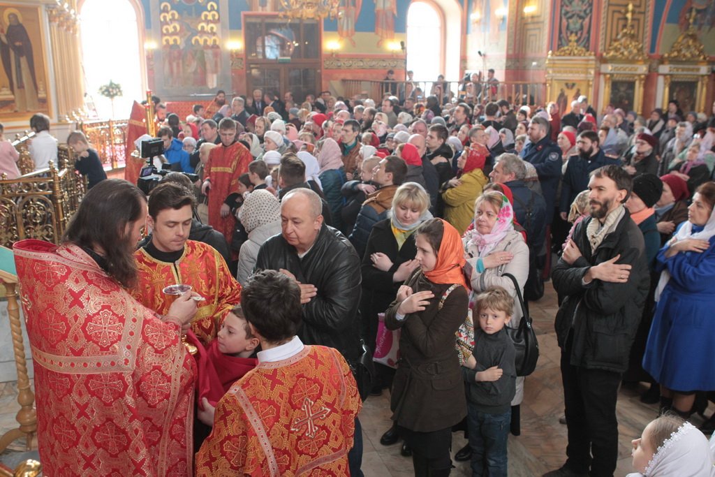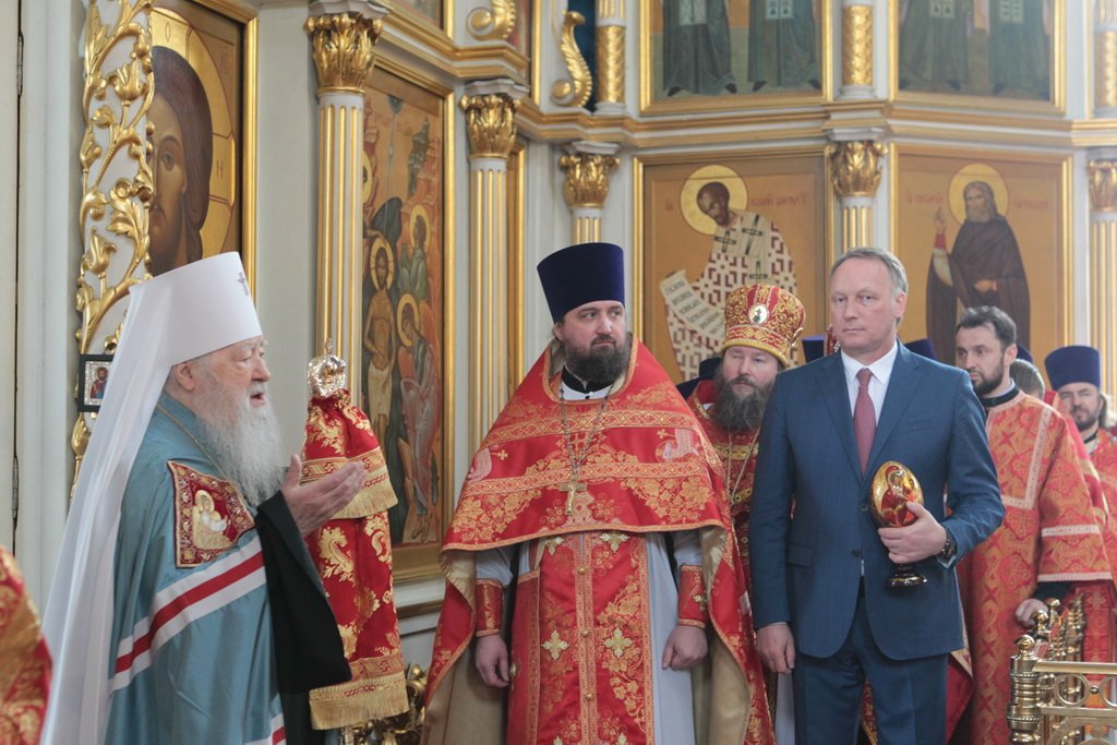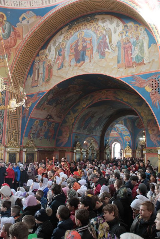 Затем митрополит Ювеналий обратился к духовенству и молящимся с архипастырским словом: «Дорогой отец Марк, уважаемый Игорь Петрович, всечестные отцы, дорогие и возлюбленные братья и сестры! Христос Воскресе! В этот день нет других слов, которые бы выражали и суть праздника, и глубокую радость. Воскресение Христово, которое воспринимается верующим сердцем, преобразует жизнь человека, и он уже не думает о смерти, как о прекращении своей жизни, но готовится к ней, как к переходу в жизнь вечную. Своим Воскресением Христос убедил нас в этой будущей жизни. И Сам, еще до Своих страданий, Он воскресил из мертвых Лазаря, который четыре дня уже был погребен (см.: Ин. 11:1–46), и тем самым уверил в будущем воскресении всех нас. А как нам праздновать Пасху? Мы должны, возлюбленные братья и сестры, вспоминать не только страдания Христовы, но и Его учение, которое запечатлено четырьмя евангелистами: Матфеем, Марком, Лукой и Иоанном, которые были живыми свидетелями того, что говорил Христос. Мы должны вникать в эти вечные страницы Евангельского учения и стремиться воплощать его в жизнь. Господь заповедал нам мир, Господь заповедал нам любить друг друга, служить друг другу до самопожертвования, быть милосердными (см.: Ин. 14:27; 13:34). И мы по силе человеческой возможности, с Божией помощью, стремимся это исполнять. Но слаб бывает человек и не исполняет заповедей Божиих. Однако у нас есть примеры того, как Христос относился к грешникам: Он милосерд, и Церковь в Таинстве Покаяния именем Божиим через священника прощает кающихся. И они, очищенные покаянием, причащением Святых Христовых Таин, получают новую силу для того, чтобы жить благочестиво. Я счастлив, что вижу вас во множестве в этом соборе. Рад, что этот собор благоукрашен. Помню, в каком тяжелом состоянии он был передан нам. И мы здесь, среди храма, устанавливали престол и служили первые Литургии. Но самое дорогое для нас — это верующие люди. Я сегодня до глубины души растроган, что вижу множество детей, которые активно участвуют в жизни Церкви, поют на клиросе, причащаются Святых Христовых Таин, учатся здесь, постигая православное учение. Я от души благодарю отца Марка за его приветствие, и Вас, уважаемый Игорь Петрович, и всех, кто с Вами сегодня присутствует здесь. Я радуюсь, что настало мирное время для нашего Отечества и свобода для Церкви Христовой, которая невозбранно осуществляет свою духовную миссию, просветительскую и социальную работу. От души желаю всем вам Божиего благословения, здоровья, счастья, благополучия. Пусть Господь хранит всех вас на многая и благая лета. Христос Воскресе! Воистину Воскресе!»