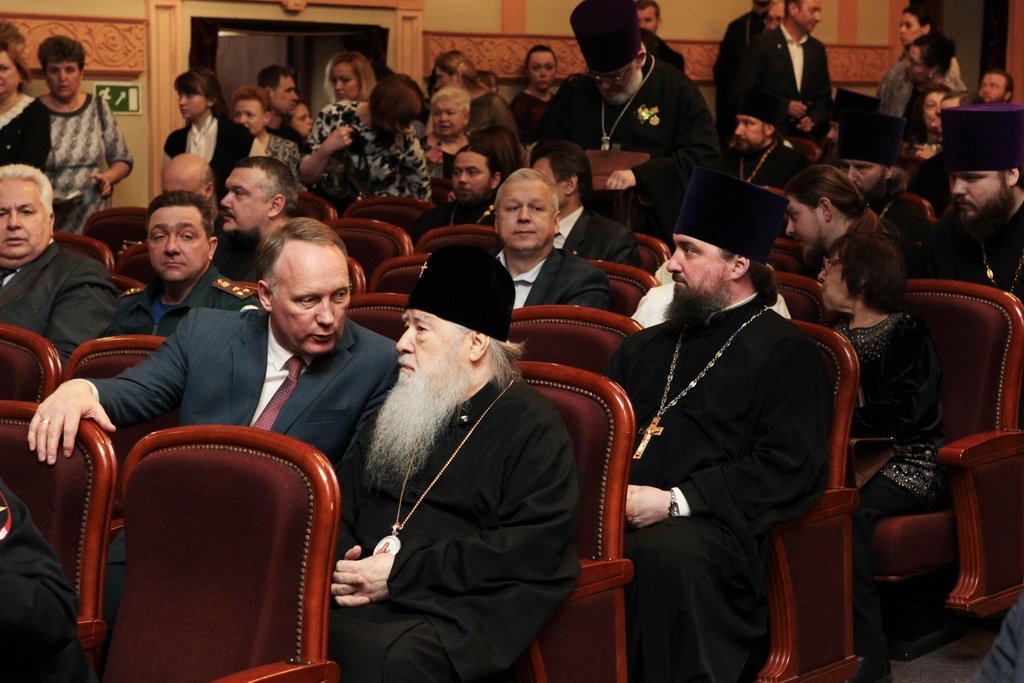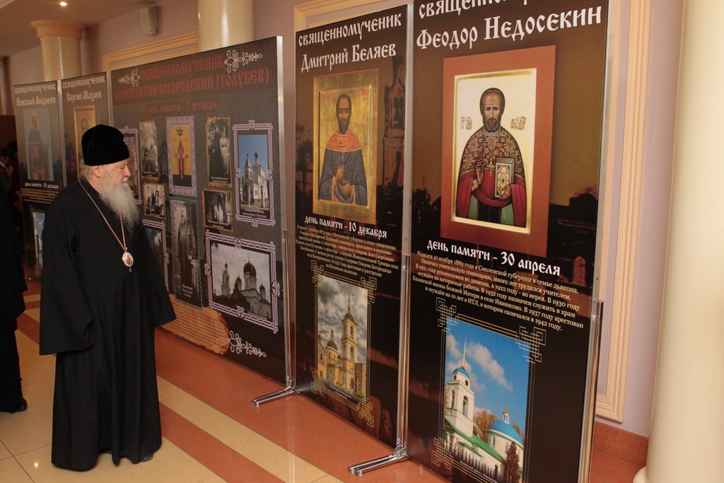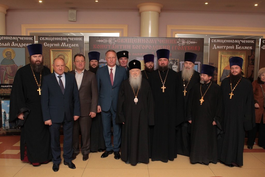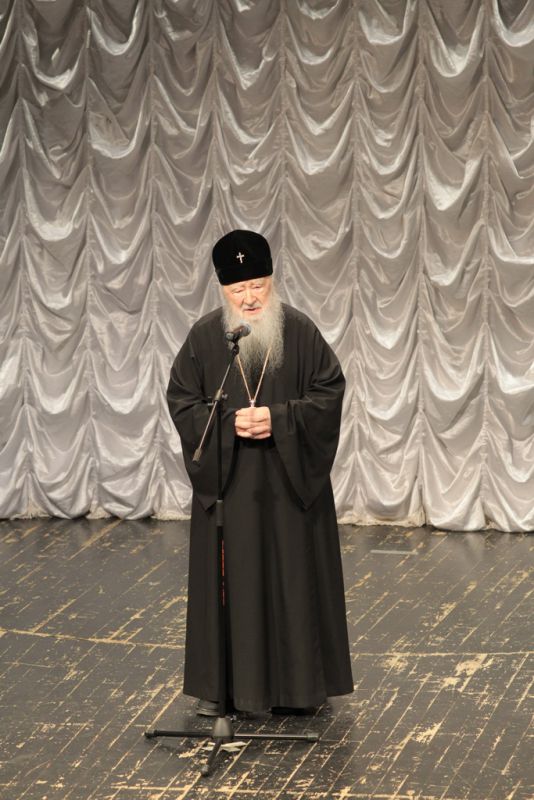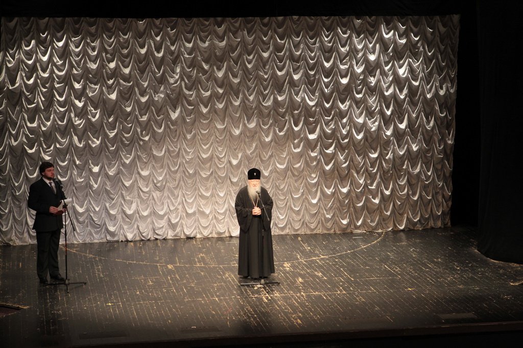 Перед началом праздничного концерта митрополит Ювеналий обратился к собравшимся с архипастырским словом: «Дорогой Игорь Петрович, дорогой отец Марк, дорогие участники нашей встречи. Христос воскресе! Воистину воскресе! Хотя сегодня рабочий день, Церковь продолжает праздновать Пасху Господню. Приятно, что вы с нами разделяете этот праздник. Вам, может быть, не понятно было, почему в фойе находится выставка новомучеников в праздник Пасхи. Я имел в свое время определенное отношение к прославлению новомучеников, потому что четверть века возглавлял комиссию Русской Православной Церкви по канонизации святых. Через нее прошли дела тысяч людей: наших православных священнослужителей, монашествующих, мирян, которых Церковь причислила к лику святых. Сегодня уже говорилось, что в этом году исполняется сто лет событиям, которые происходили в нашей стране с начала 1917 года. Когда мы рассматривали жизнь и смерть наших новомучеников, мы могли по совести свидетельствовать, что это были патриоты России, что это были истинно верующие во Христа люди. Но судьба так сложилась, что они встретились с требованием или отречься от Христа, или принять мученическую смерть. Все, кого вы видели здесь, на этой выставке, — это люди, которые ни в чем себя не запятнали ни перед государством, ни перед народом, ни перед Церковью, но предпочли мученическую смерть измене Христу. Я сегодня совершил Литургию в Богоявленском соборе и поклонился мощам священномученика Константина Богородского. Это был светлейший человек, педагог, пастырь. Трудно без слез вспоминать, как он был заживо погребен