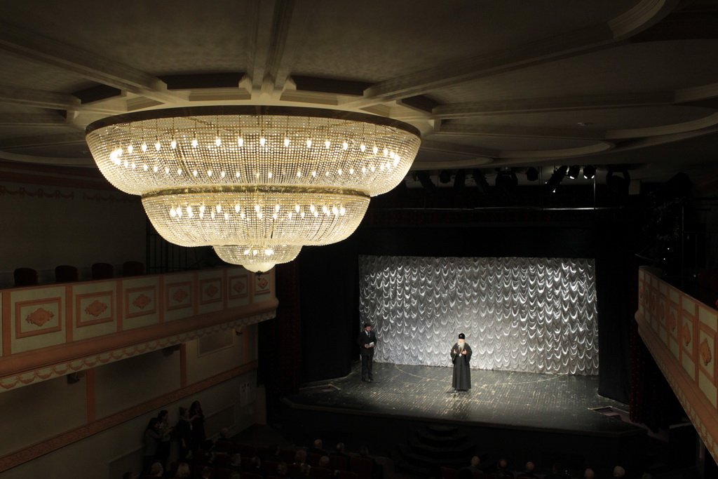 Затем Владыка в сопровождении духовенства посетил Московский областной театр драмы и комедии, расположенный в г. Ногинске, где состоялся спектакль театра «МыМ» («Мы можем») о священномученике Константине Богородском и концерт творческих коллективов Богородского края, подготовленный отделом культуры администрации Ногинского района совместно с Богородским благочинием. В фойе драмтеатра была представлена выставка, посвященная новомученикам и исповедникам Богородского края.