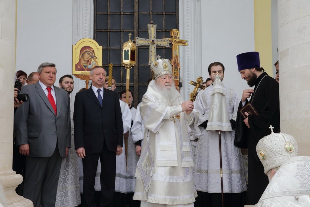 По заамвонной молитве состоялся крестный ход, в завершение которого на паперти храма со словами приветствия к митрополиту Ювеналию обратился А. Д. Беглов: «Ваше Высокопреосвященство, досточтимые Владыки, отцы честные, братья и сестры, братья казаки! Дорогой Владыка Ювеналий, хотел бы всех поздравить с престольным праздником сошествия Святого Духа на апостолов. Огромное Вам спасибо за то, что вы сегодня освятили этот храм. Сюда будут приходить люди не только из этого поселка, но и из окрестных деревень. Будут молиться и спасаться. Я хотел бы поблагодарить всех участников восстановления этого храма. И Вас, Владыка, и Попечительский совет, и благотворителей, и простых прихожан, которые длительное время принимали участие в востановлении порушенного храма. Хотел бы сказать слова благодарности и строителям, которые качественно восстанавливали порушенную святыню. В день престольного праздника этого храма я хотел бы от лица Попечительского совета и благотворителей преподнести настоятелю ковчег со святыми мощами. Большое всем спасибо, всех с праздником!»