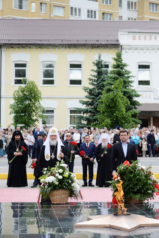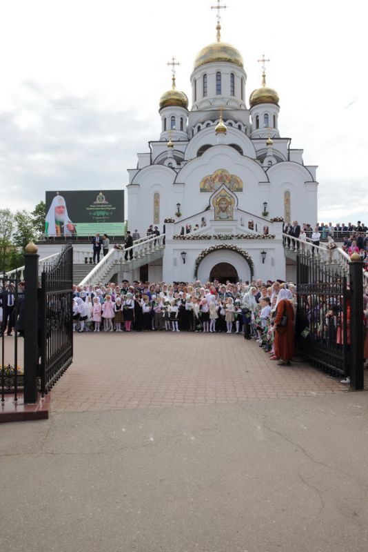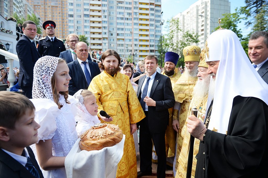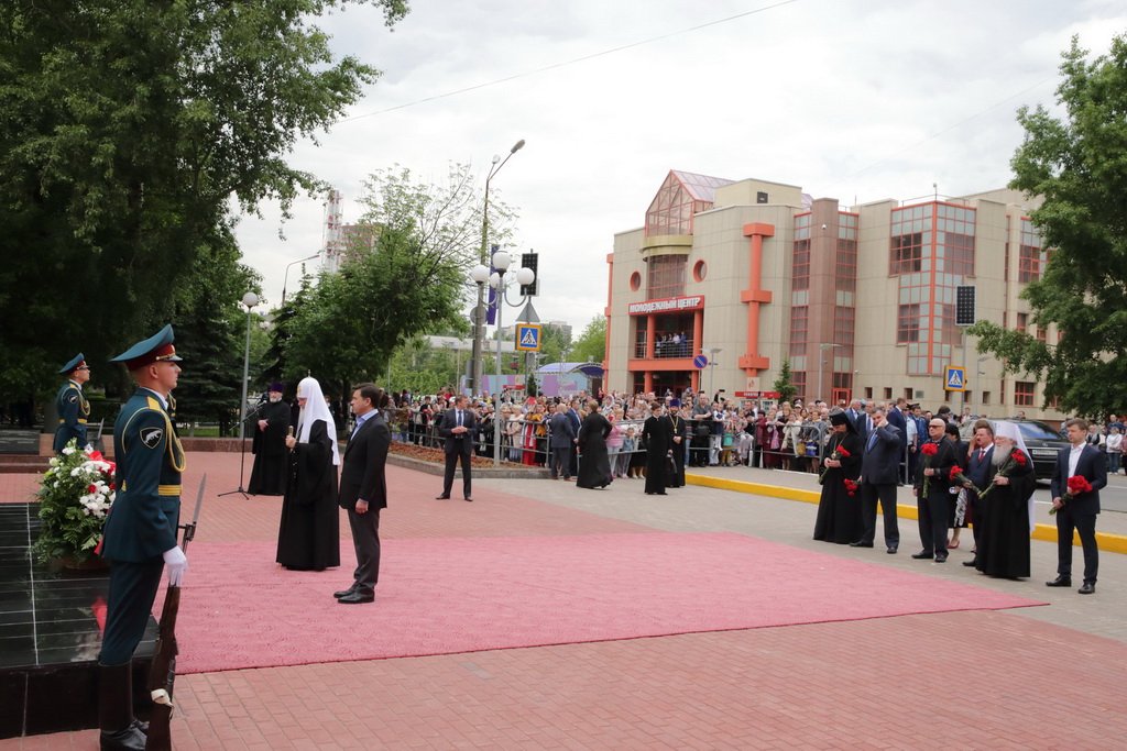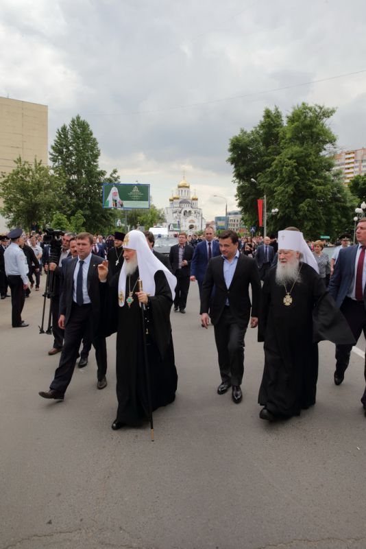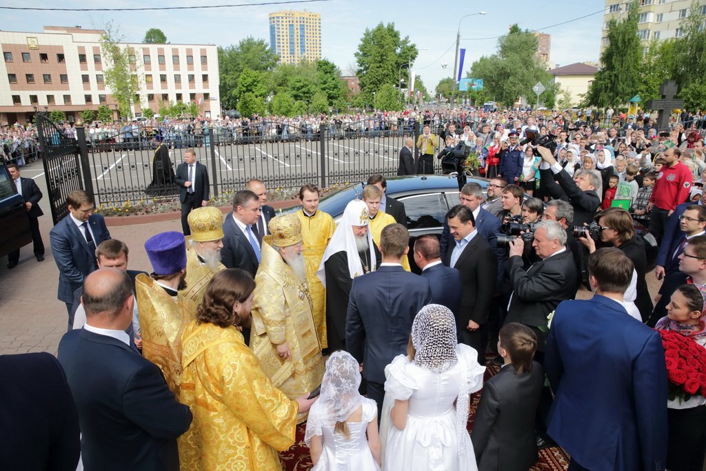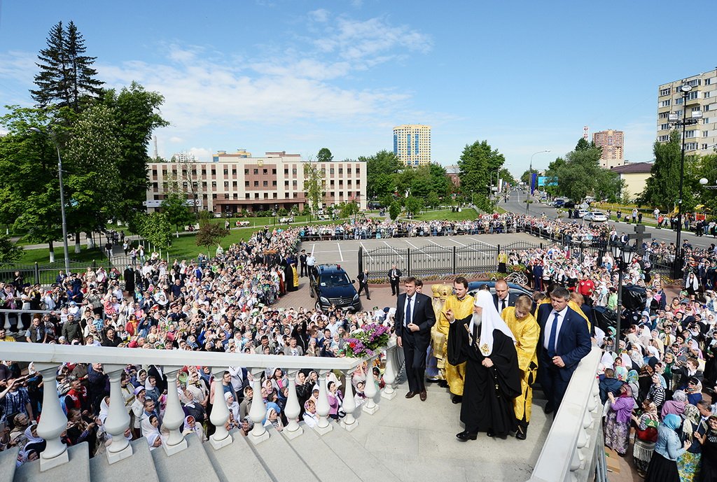 На площади у ступеней Свято-Троицкого храма г. Реутова Предстоятеля Русской Православной Церкви встречали митрополит Крутицкий и Коломенский Ювеналий, губернатор Московской области А.Ю. Воробьев и многие общественные лица.