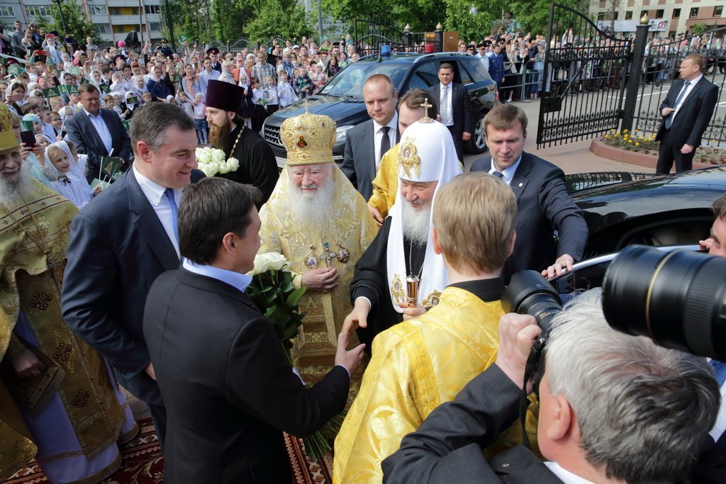 Сегодня Вы совершили Божественную литургию в Свято-Троицком храме, построенном верой и любовью прихожан, которых вдохновил Ваш Первосвятительский призыв. Очень важно, Ваше Святейшество, что мы — архипастыри, пастыри и Ваша многомиллионная паства — повседневно, как и сегодня, слышим Ваши наставления, стремясь их исполнить, взирая на то, каким путем крестоношения, мужественно несете Вы свое Первосвятительское служение. Позвольте, Ваше Святейшество, преподнести Вам этот образ Святейшего Патриарха Тихона на фоне этого храма, в котором Вы совершили сегодняшнее богослужение.