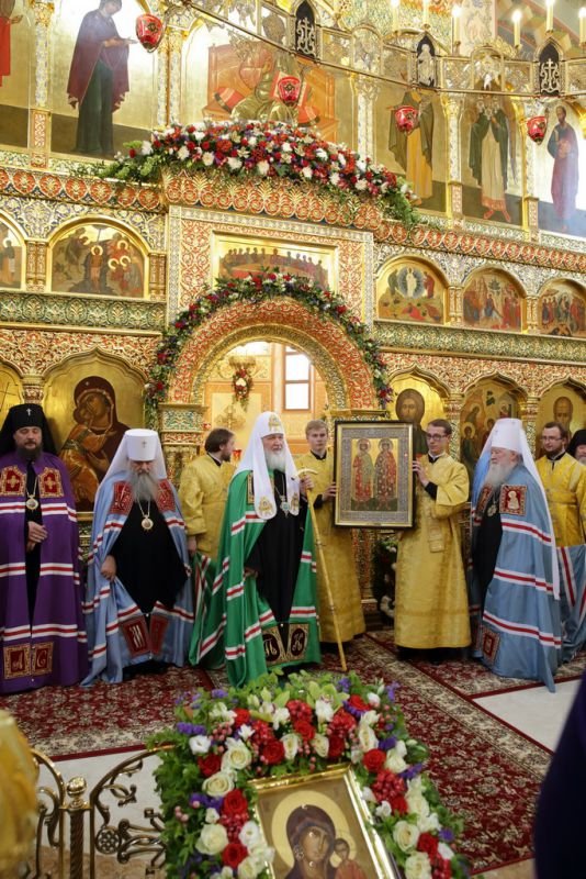 В дар Троицкому храму Предстоятель Русской Церкви передал икону святых благоверных князей Бориса и Глеба.