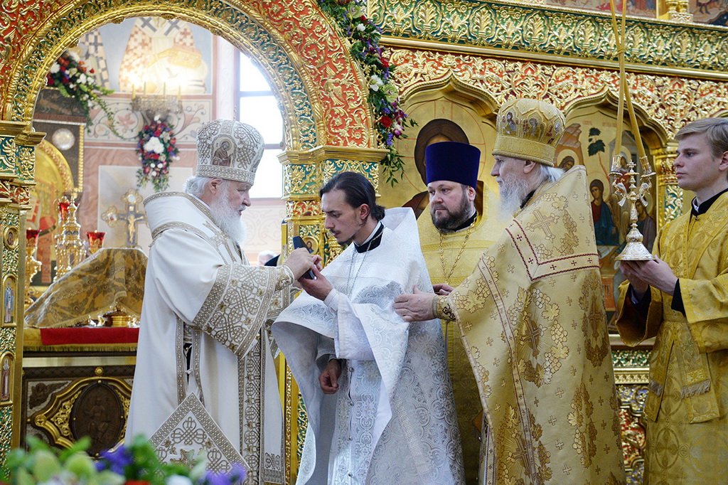 За Литургией Святейший Патриарх Кирилл рукоположил диакона Алексия Майорова, направленного на временное служение в храм Всемилостивого Спаса бывшего Скорбященского монастыря г. Москвы, в сан пресвитера.