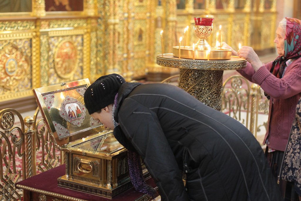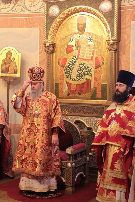 По окончанию богослужения благочинный Балашихинского округа протоиерей Димитрий Мурзюков поприветствовал Владыку Григория и преподнес ему образ Божией Матери, именуемый «Троеручица».