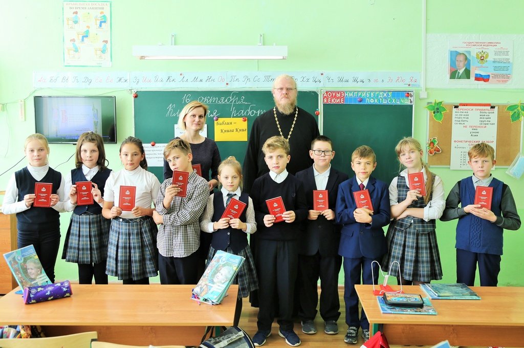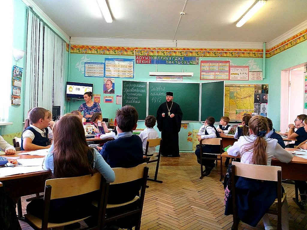 16 октября в средней школе деревни Крупино прошел урок по «Основам православной культуры», который провел настоятель Никольского храма села Ново-Загарье протоиерей Димитрий Босов. Первая часть урока была посвящена теме «Библия и Евангелие», а во второй части дети узнали о новомучениках Павлово-Посадских и священномученике Александре Воздвиженском.