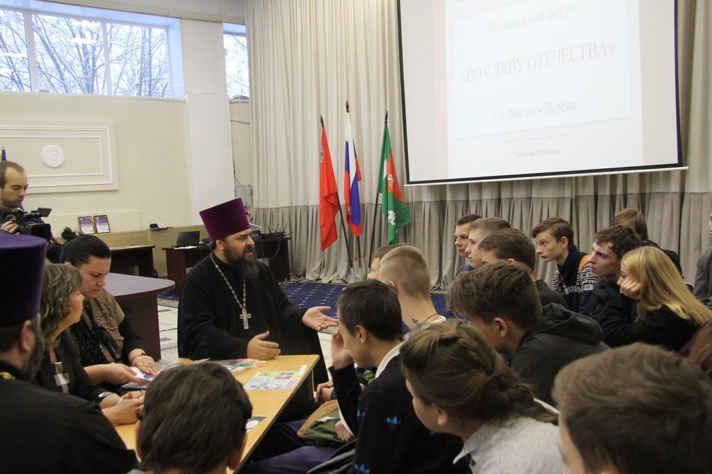 7 декабря в культурно-досуговом центре «Спутник» г. Ликино-Дулево состоялся ежегодный молодежный форум «Во славу Отечества». Во встрече приняли участие студенческая и рабочая молодежь городского округа Ликино-Дулево, представители государственных и общественных организаций региона, благочинный Ликино-Дулевского церковного округа священник Антоний Рыжаков и настоятель Ахтырского храма деревни Яковлево священник Михаил Лытьков.