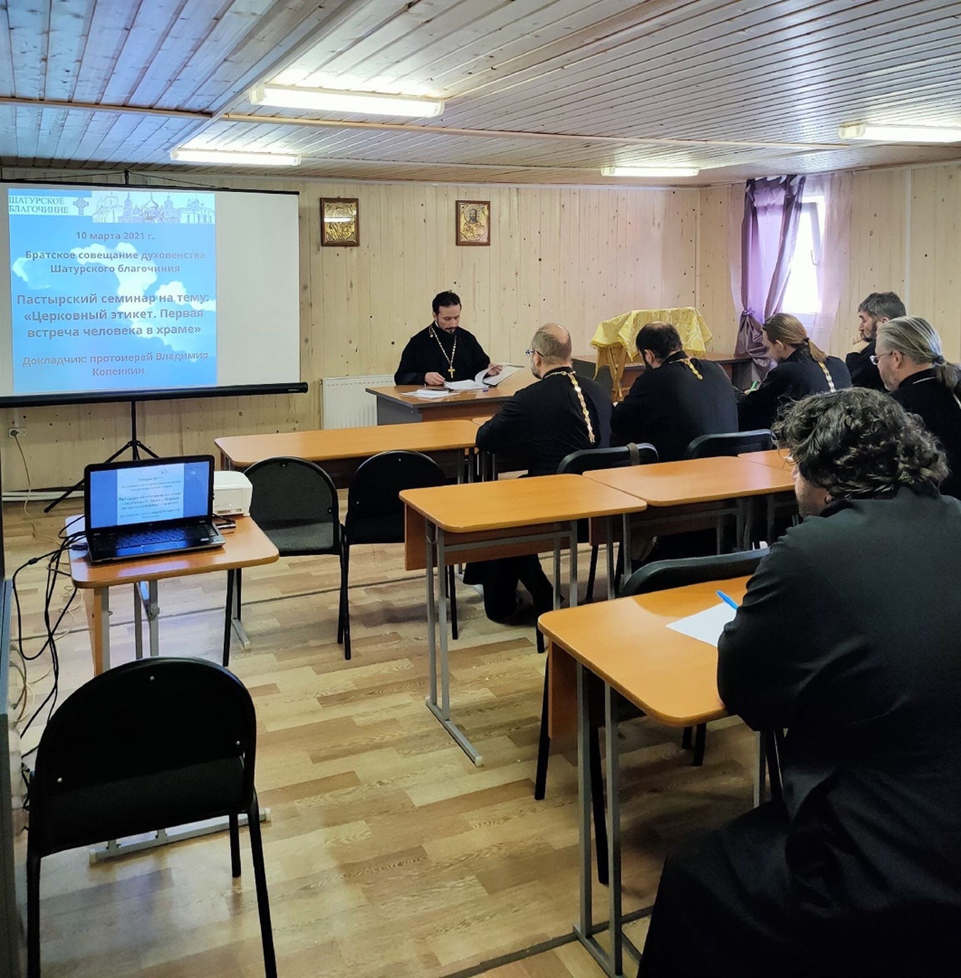 10 марта в приходском доме Никольского храма г. Шатура состоялось братское совещание духовенства Шатурского благочиния, которое провел благочинный священник Владислав Решетников. На пастырском семинаре «Церковный этикет. Первая встреча человека в храме» с докладом выступил настоятель Димитрие-Солунского храма села Дмитровский Погост протоиерей Владимир Копёнкин.