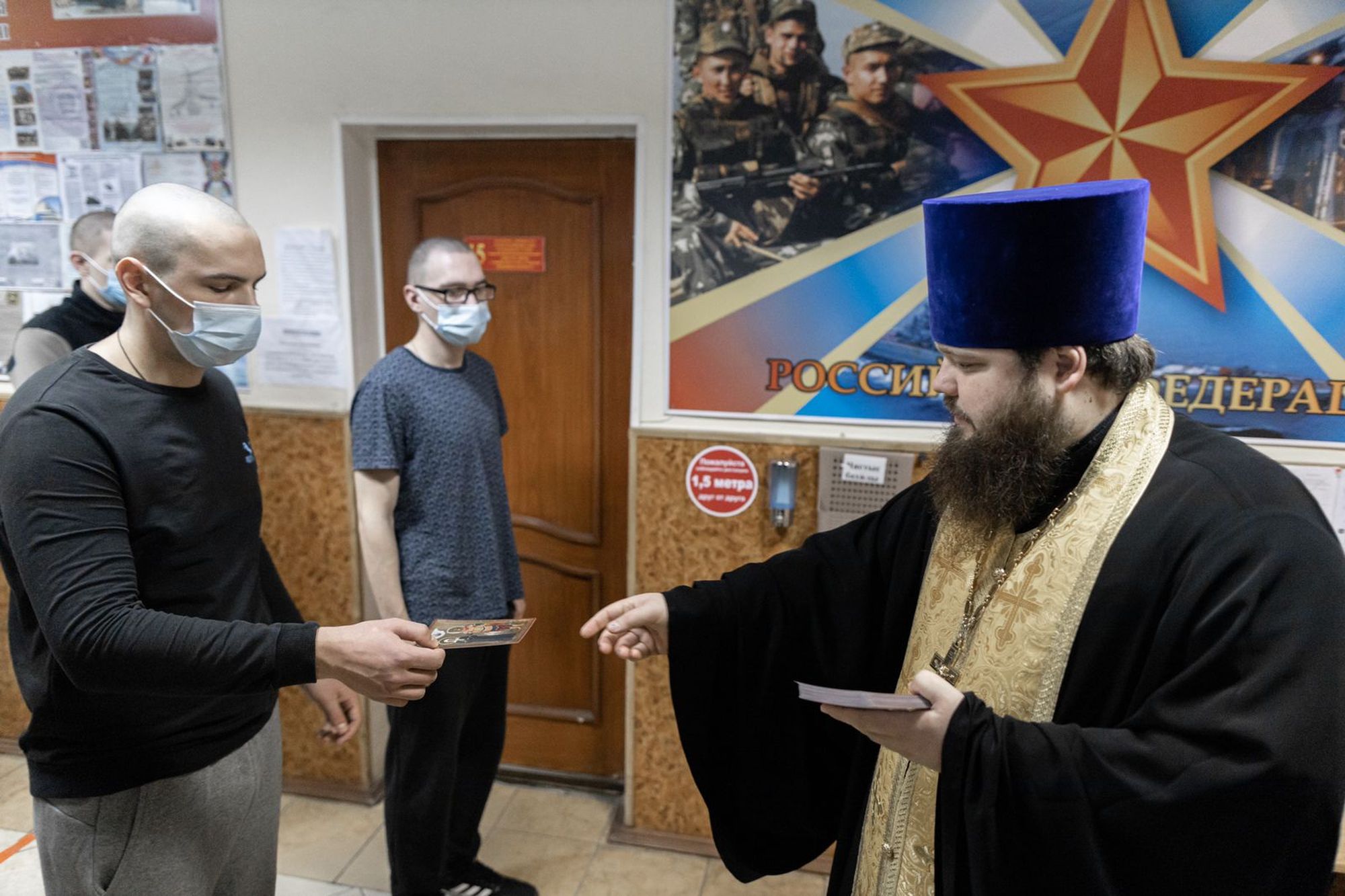 Благочинный церквей Павлово-Посадского округа священник Александр Анохин обратился к собравшимся с напутственным словом, совершил молитву и передал каждому призывнику в благословение икону великомученика Георгия Победоносца.