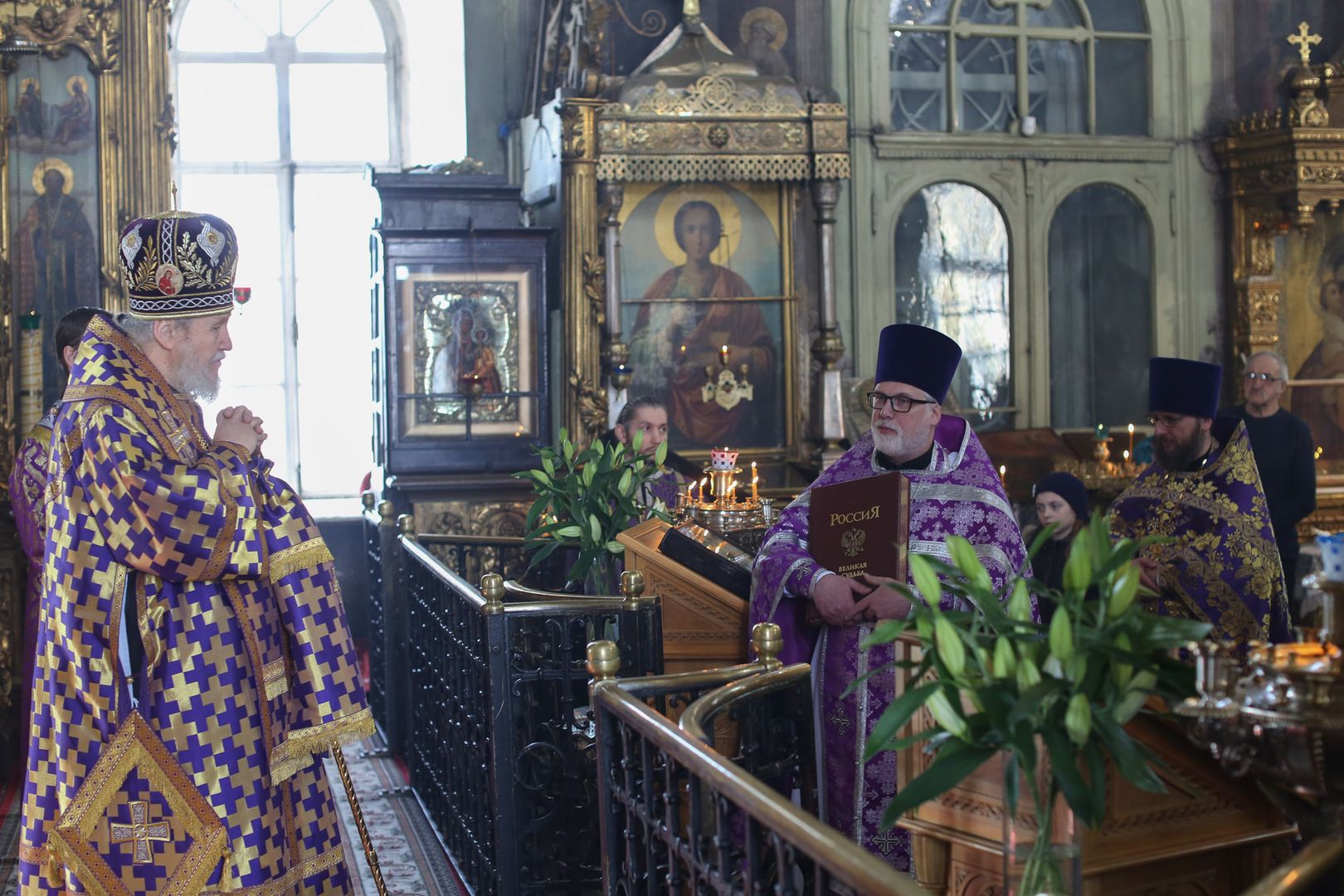 По окончании Литургии отец настоятель поблагодарил епископа Николая за совершенное богослужение и преподнес ему подарочную книгу об истории России.