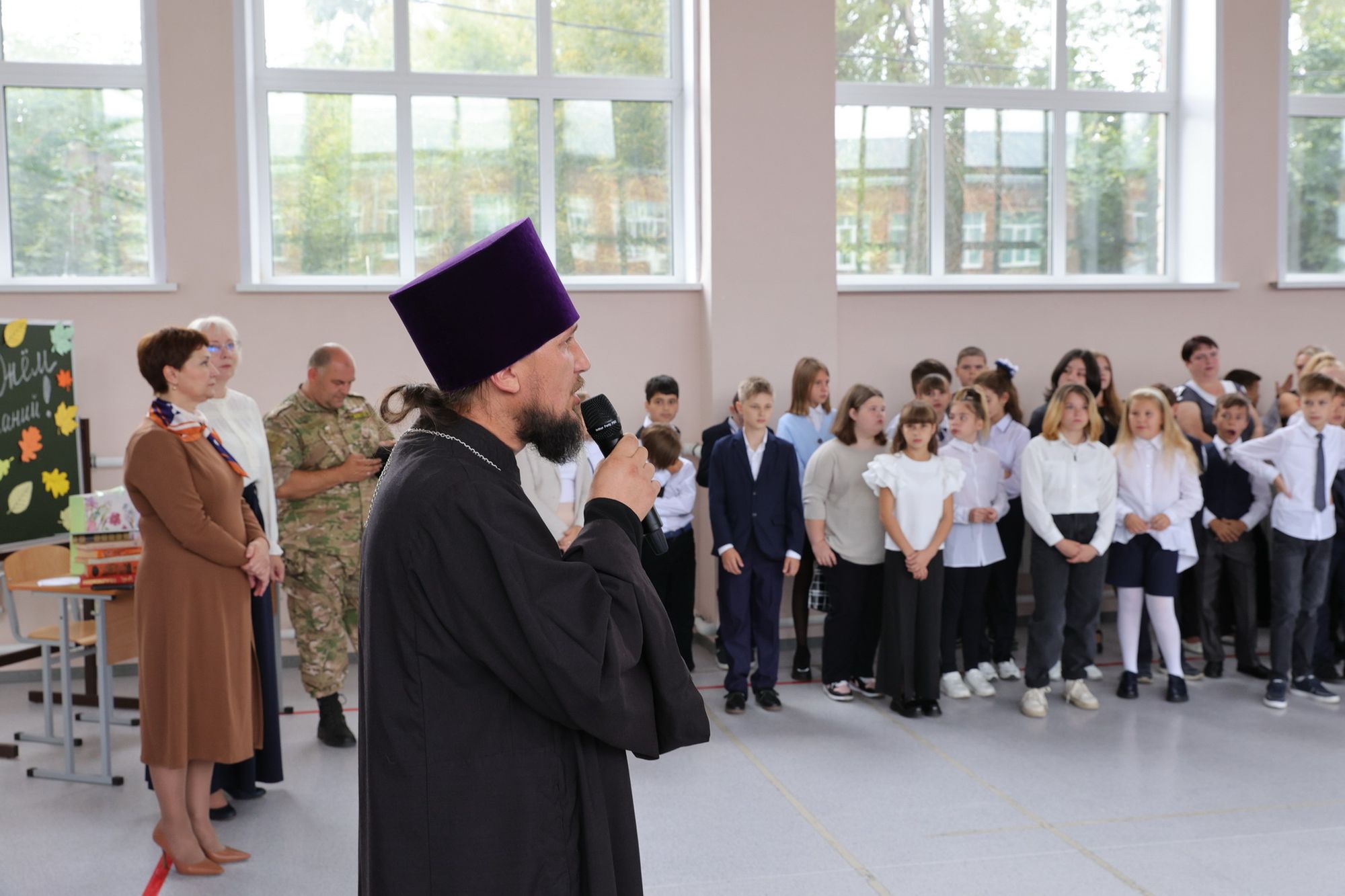 Председатель Епархиального отдела по работе с медицинскими учреждениями священник Павел Скрипник обратился со словами поздравления к педагогам, воспитанникам и их родителям в гимназии №14 и средней школе №16.