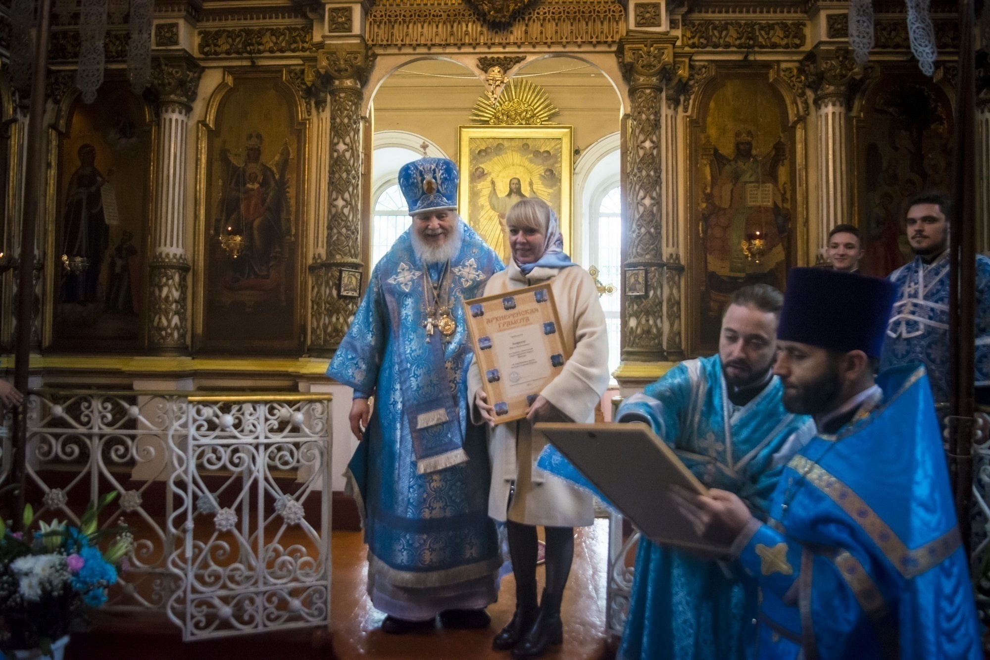 Затем Его Преосвященство обратился к духовенству и молящимся с архипастырским словом и вручил церковные награды. Супруги клириков Никольского храма г. Шатура К. В. Боярских и О. В. Овчинникова были удостоены Патриарших знаков материнства 2-й степени, настоятель храма протоиерей Михаил Депутатов (к пятидесятилетию служения в священном сане), исполняющий обязанности первого заместителя главы городского округа Шатура П. Н. Андреев и директор предприятия «ВИПстрой-Инвест» И. В. Горошко – Архиерейских грамот Балашихинской епархии.