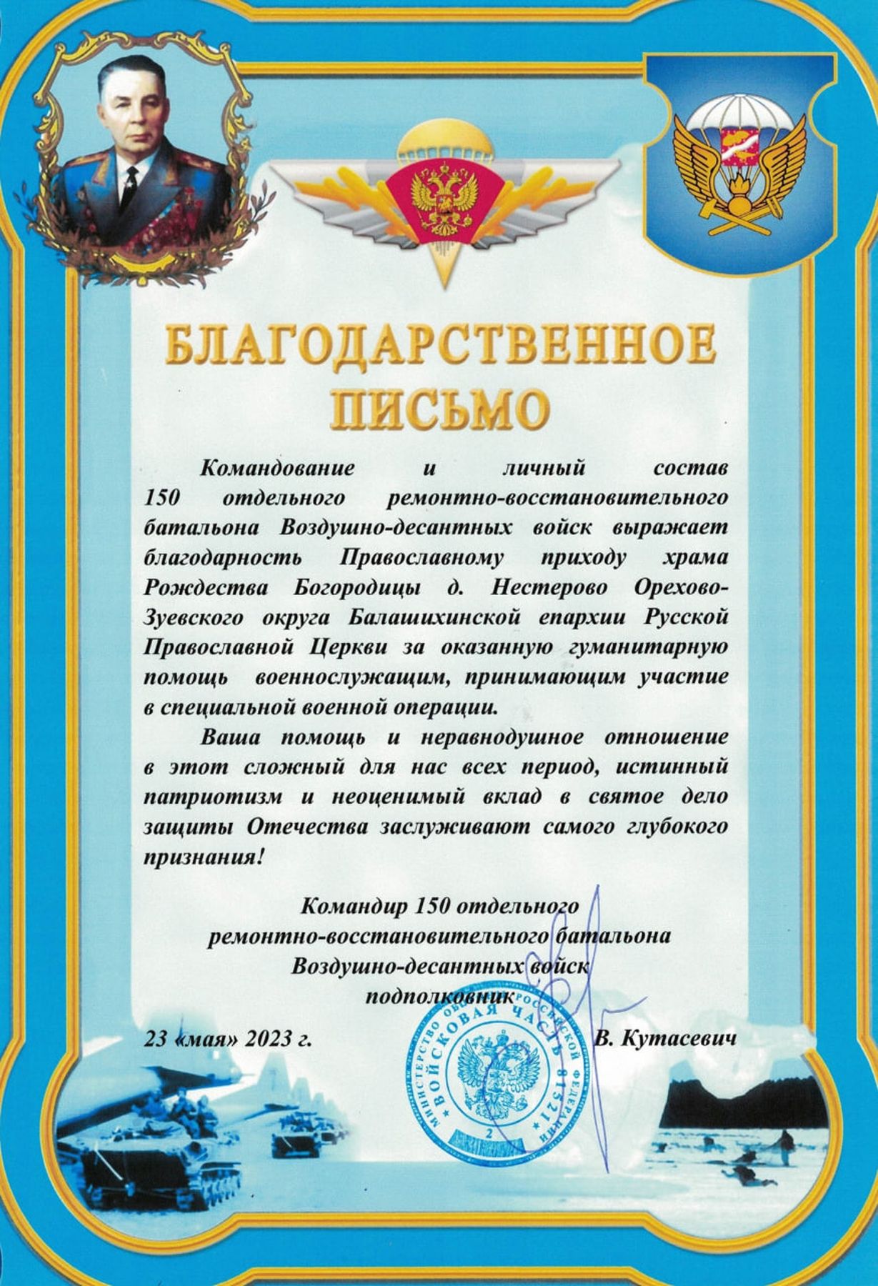 7 июня, в день Рождества Иоанна Предтечи и Крестителя Господня, после Божественной литургии представитель 150-го отдельного ремонтно-восстановительного батальона ВДВ передал настоятелю Богородицерождественского храма деревни Нестерово священнику Сергию Томашевскому благодарственное письмо приходу за гуманитарную помощь, оказанную военным.