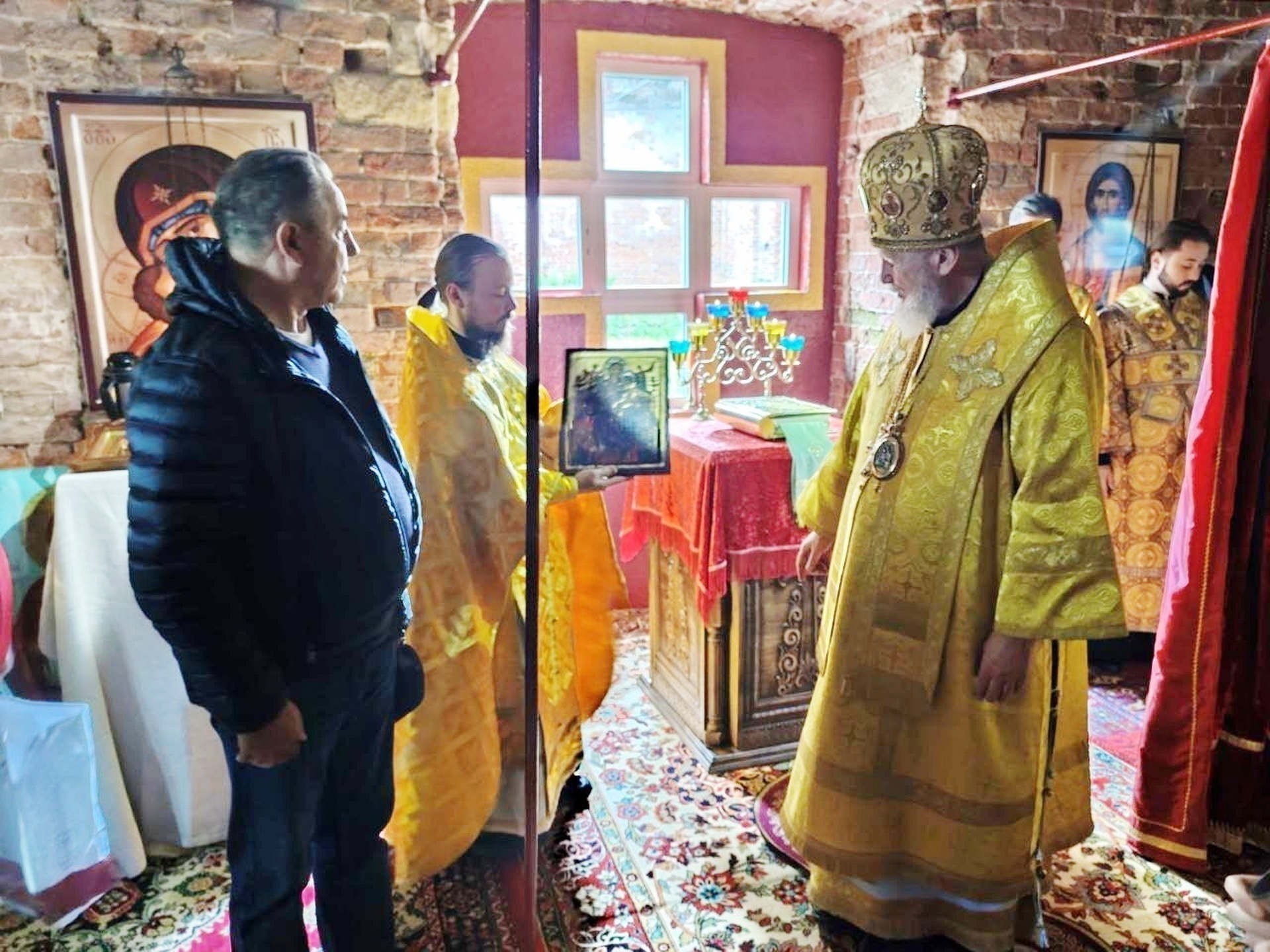 В завершение Владыку приветствовал отец благочинный, после чего Валерий Аксаков поблагодарил Его Преосвященство за архипастырский визит и преподнёс ему икону Божией Матери «Всецарица», которая, по благословению Владыки Николая, останется в Богородицерождественском храме как главная приходская святыня.
