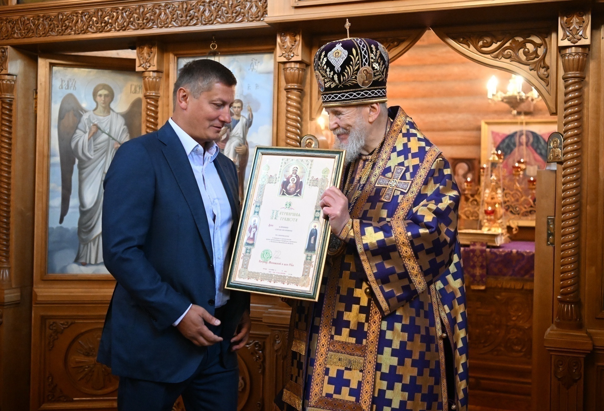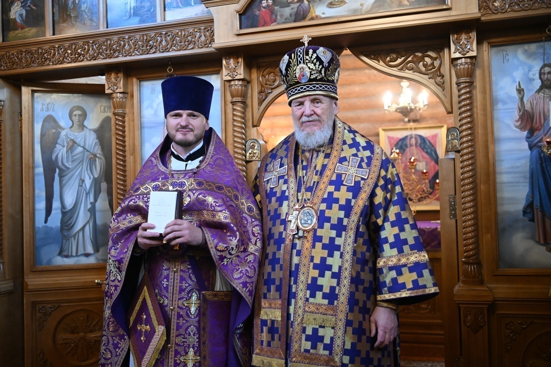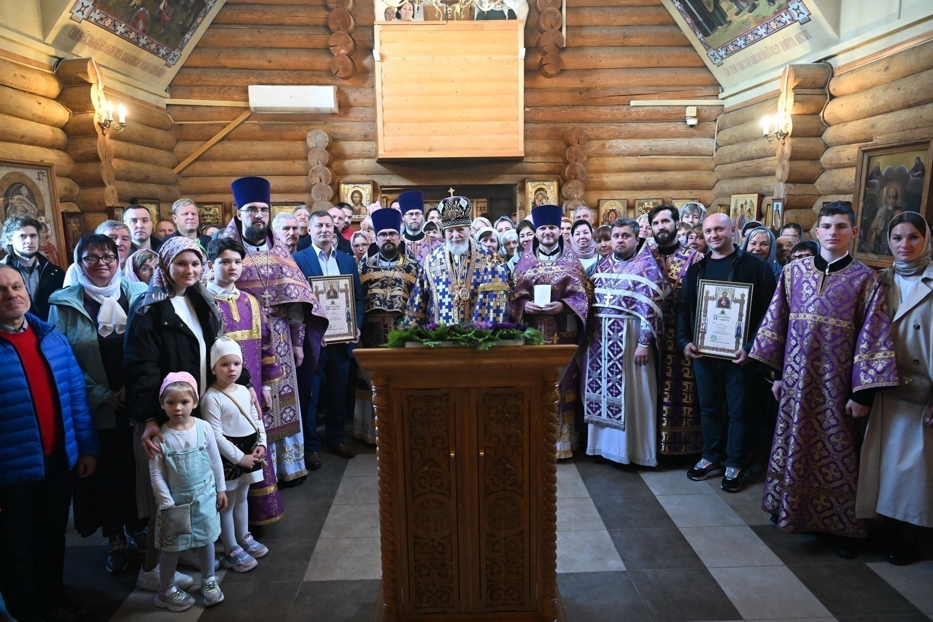 Затем Его Преосвященство обратился к сослужившему духовенству и молящимся с архипастырским словом, после чего вручил Патриаршие награды потрудившимся на благо Святой Церкви: настоятель храма священник Евгений Емельянов был удостоен Медали Ордена Русской Православной Церкви преподобного Серафима Саровского, ктиторы прихода С. И. Алёшин и С. Н. Дуров были удостоены Патриарших грамот .