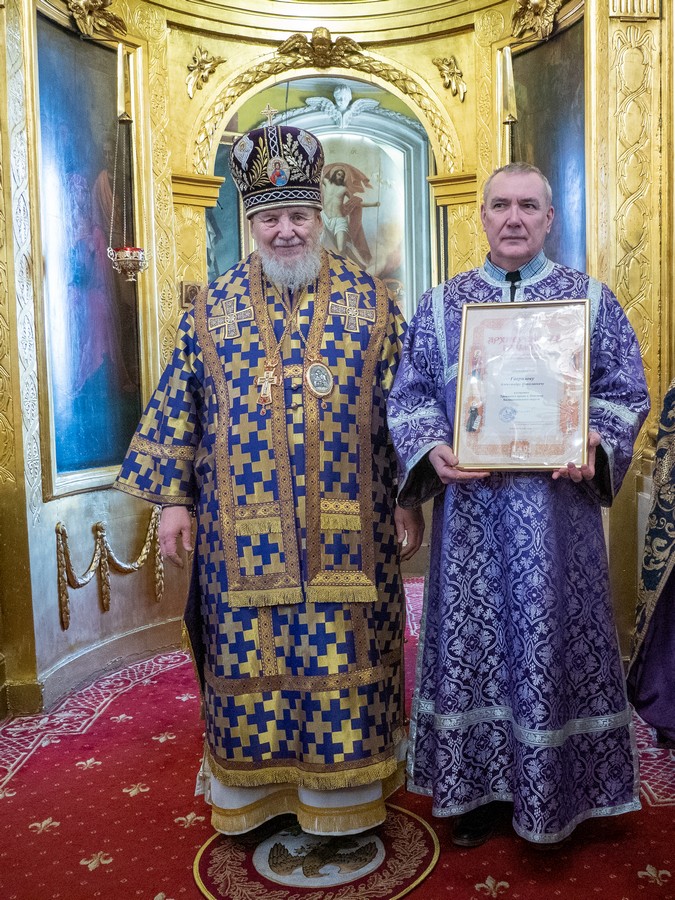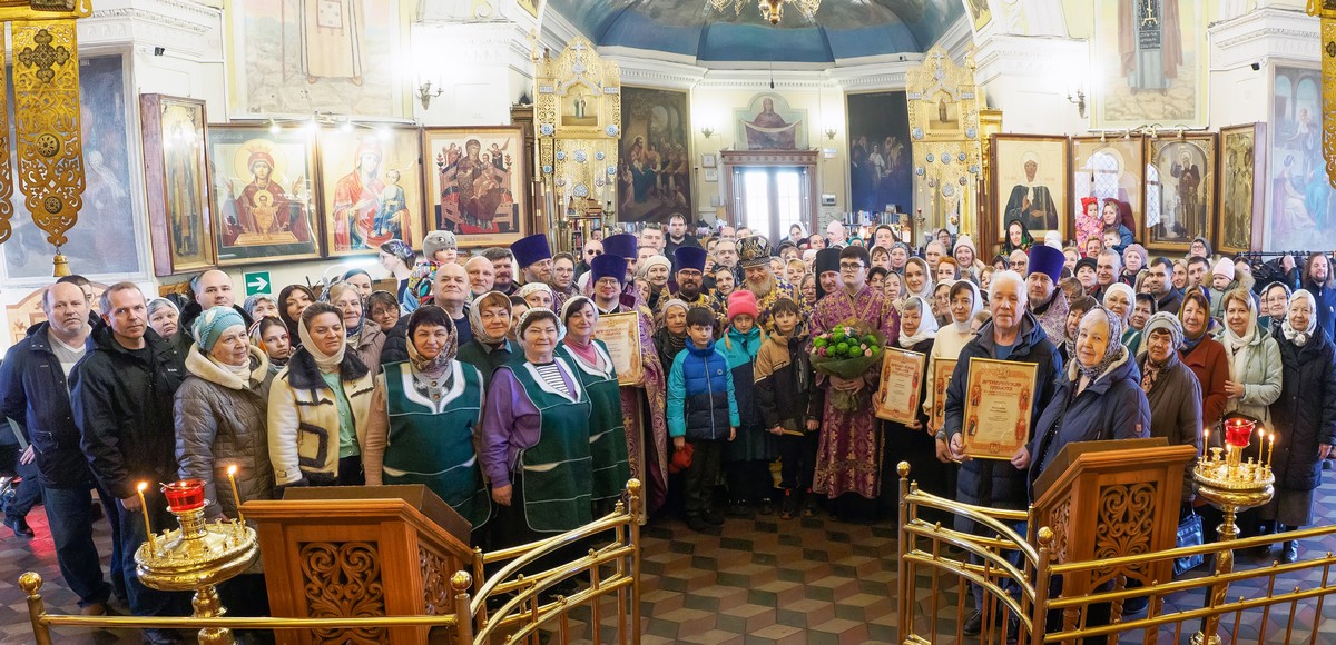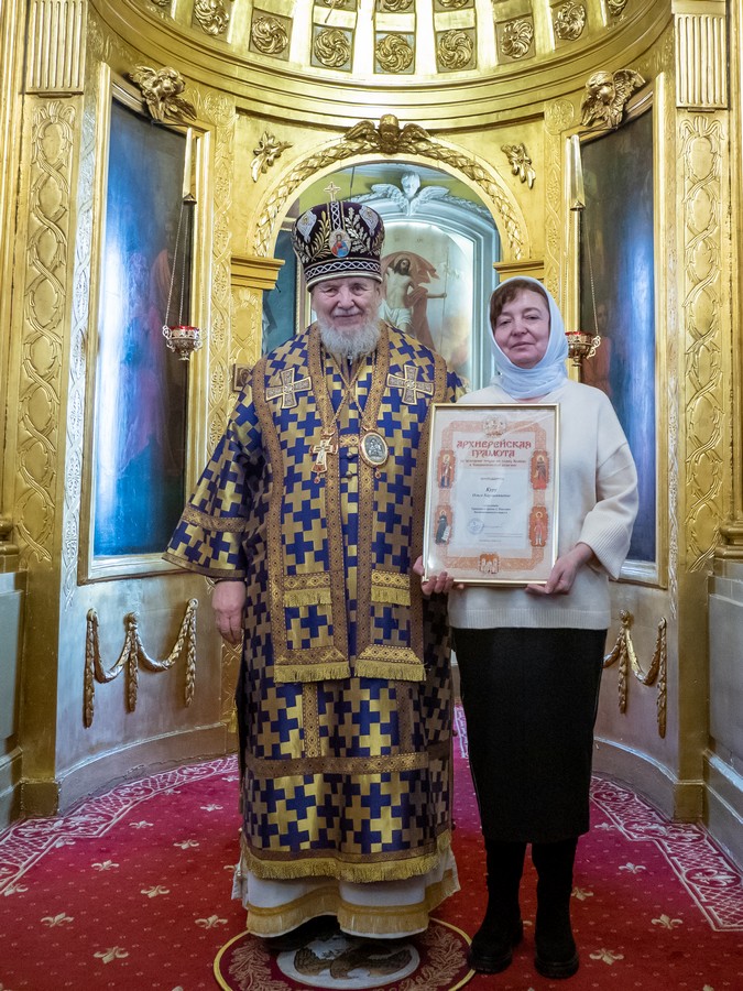 Затем епископ Николай обратился к сослужившему духовенству и молящимся с архипастырским словом и вручил Архиерейские грамоты Балашихинской епархии труженикам прихода, отмечающим в этом году личные юбилейные даты.