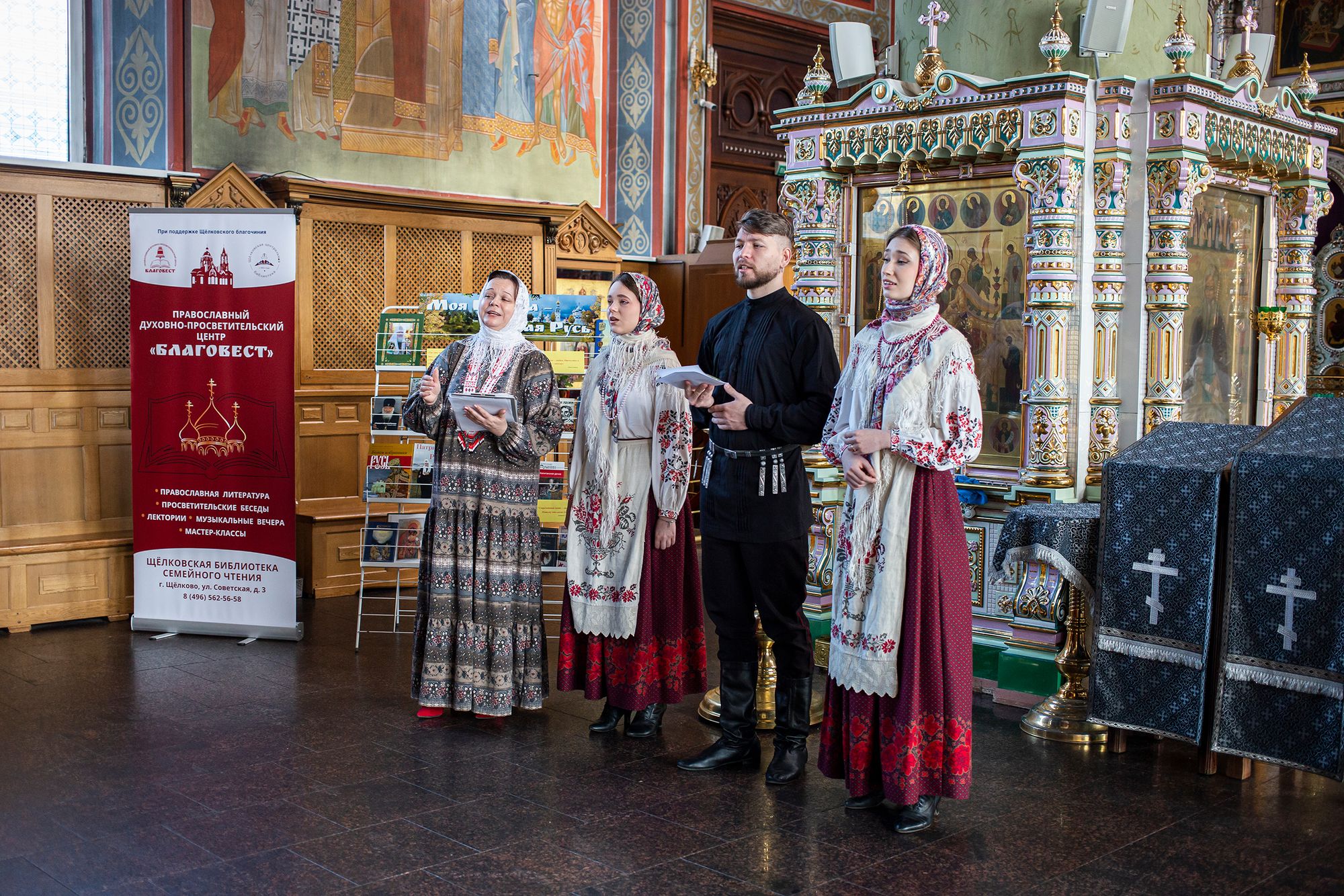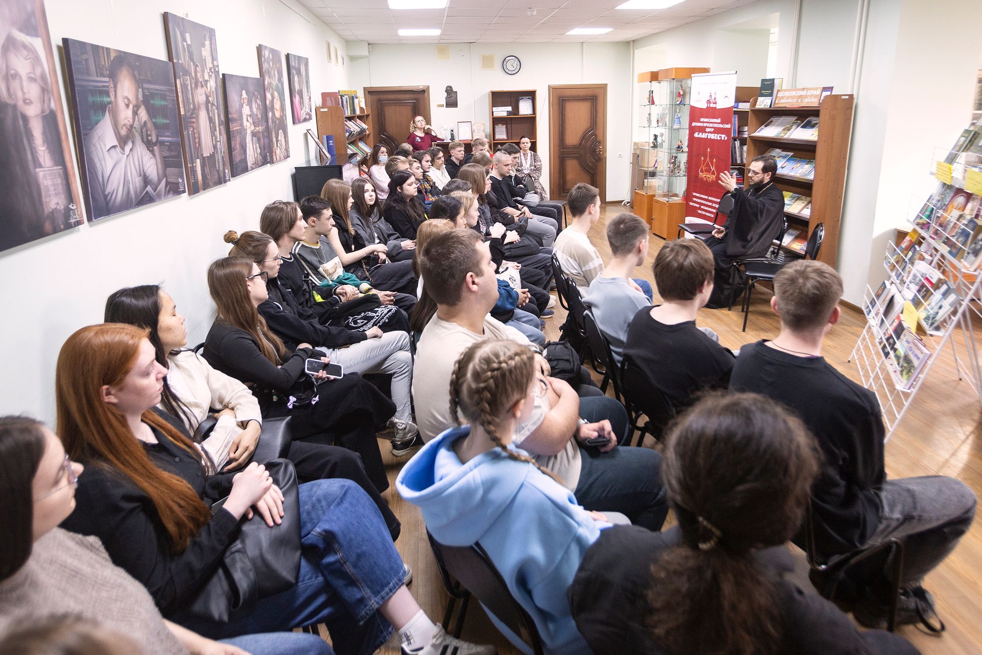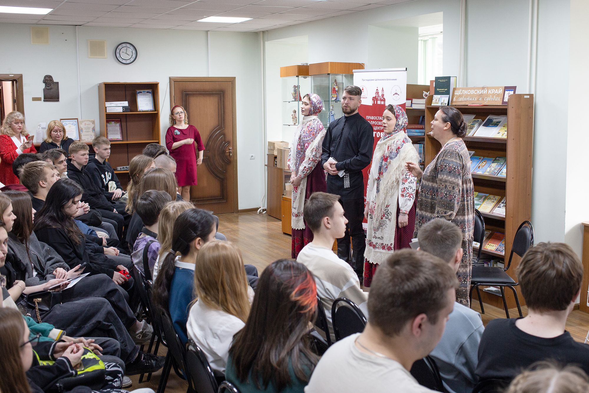 В этот же день подобная встреча была организована в Православном духовно-просветительском центре «Благовест» при городской библиотеке семейного чтения, который в этот день посетили учащиеся Щёлковского колледжа информационных технологий и права. Сотрудники центра «Благовест», артисты Ансамбля казачьей песни «Кладезь» и клирик Троицкого собора священник Роман Галиев рассказали собравшимся ребятам о православных традициях казачества на Руси.