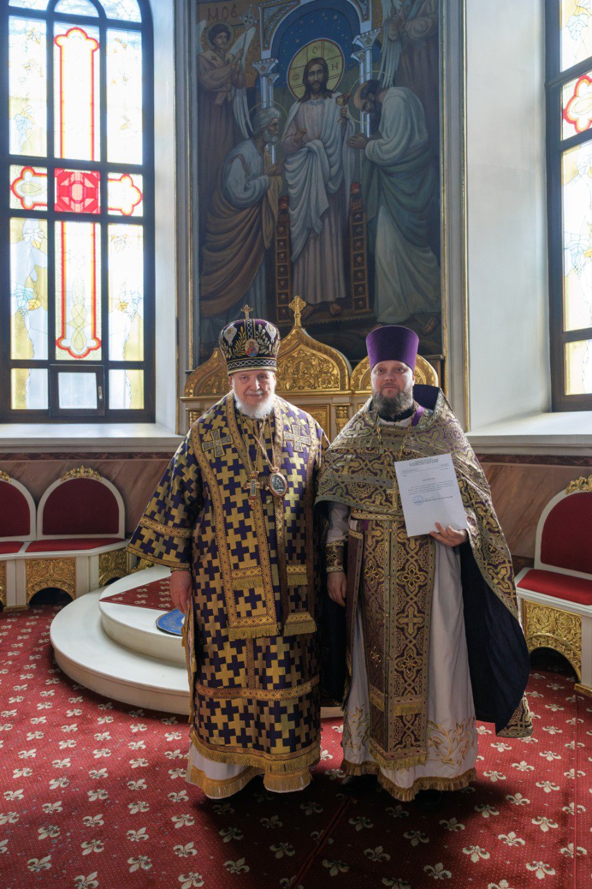 На малом входе Владыка Николай вручил председателю Епархиального отдела по взаимодействию с медицинскими учреждениями священнику Павлу Скрипнику богослужебную награду к празднику Святой Пасхи - золотой наперсный крест.