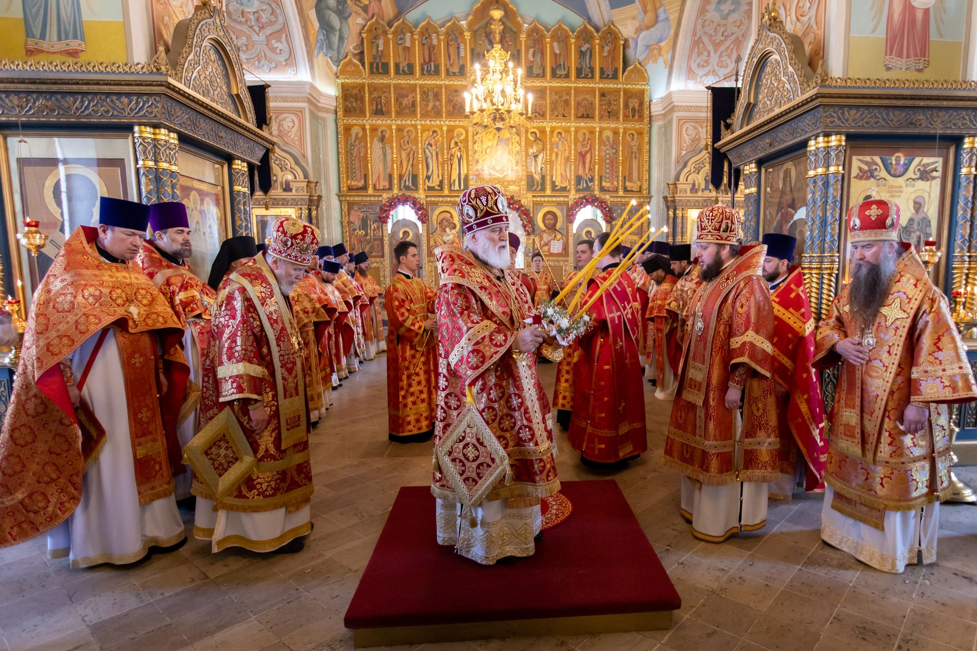 Архипастырям сослужили: секретарь Коломенского епархиального управления иерей Андрей Згонников, секретарь Святейшего Патриарха по Московской области протоиерей Дионисий Казанцев, ректор Коломенской духовной семинарии протоиерей Вадим Суворов, настоятель единоверческого Михайло-Архангельского храма в Михайловской слободе архимандрит Иринарх (Денисов), руководитель юридической службы Московской митрополии иерей Василий Лосев, а также благочинные церковных округов Коломенской епархии, игумены монастырей и клирики собора.