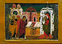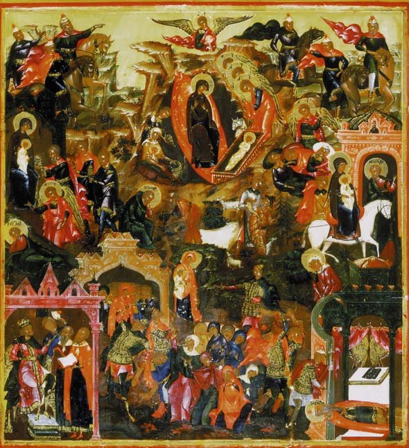 Именно поэтому сюжет обрезания в иконографии младенческого возраста Спасителя весьма редок. Даже в позднейших композициях Рождества Христова, изобилующих подробнейшими деталями евангельского описания событий, обрезания мы не находим. Так, на палехской иконе начала XIX в. можно найти все, кроме сцены обрезания.
