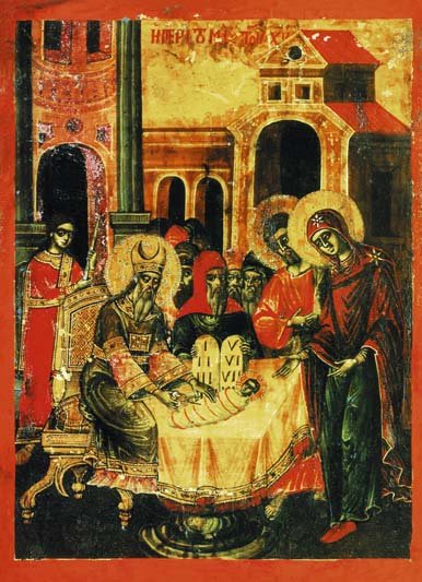 Следующее событие земной жизни Господа — принесение в Иерусалимский храм на сороковой день по Рождестве. Иконография Сретения Господня сложилась значительно позднее, чем Рождества Христова, но икон праздника существует неисчислимое множество.