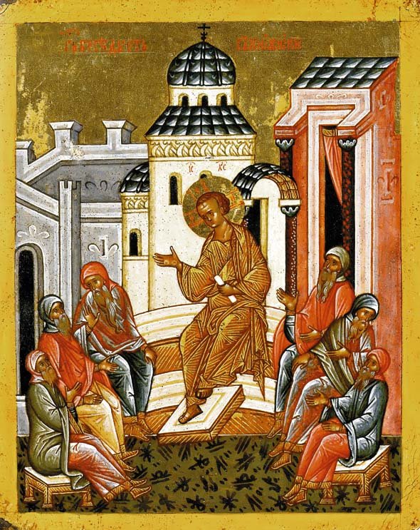 Следующее после бегства Святого семейства в Египет событие из детства Спасителя, упоминаемое в Евангелии, — беседа двенадцатилетнего Иисуса с учителями Израилевыми в Иерусалимском храме (Лк. 2:42–52). Раннехристианские сюжеты, показывающие сидящего среди учителей Христа, можно найти уже в росписях катакомб, но, по выражению