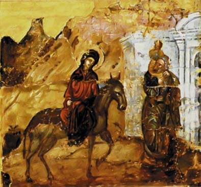 Иногда осла ведет юноша, а Иосиф с Младенцем на плечах следует за Богоматерью (миниатюра Гелатского Евангелия XII в. из Тбилисского Института рукописей). К такому типу относится и клеймо греческой иконы Акафиста Богородице начала XVI в. [Синксис].