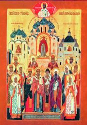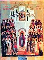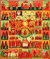 Но иконография Собора русских святых, окрыленных видениями тайными и достигших жилищ небесных, складывается значительно позднее. Конечно, иконы каждого из новопрославленных святых появлялись следом за их канонизацией. Но собрать в едином иконном пространстве весь собор угодников Божиих Святой Руси удалось только в первой половине ХХ в.
