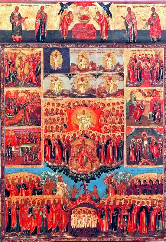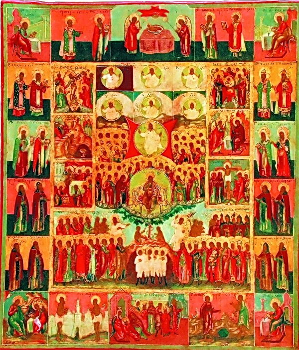 Конечно, первые изображения Собора Русских святых появились значительно раньше. Образцом для такой иконографии, как и для создания службы им, были композиции «Суббота всех святых», известная по иконам Шестоднева уже в начале XVI в. На иконе Шестоднев из Третьяковской галереи, относящейся к кругу Дионисия, представлены десять ликов праведных — убелившийся паче снега человеческий род, — предстоящих Спасу Еммануилу, окруженному Богоматерью, Предтечей и собором архангелов. Чины святых представлены следующие: блаженные, 12 апостолов, преподобные, святители, пророки,