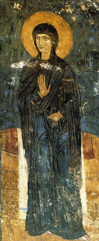 Самыми ранними из дошедших до нас изображений Богоматери в храмовой росписи являются мозаики собора Киевского Софийского собора. Об основании этого величественного храма сообщает Ипатьевская летопись под 1037 г.: «Заложи Ярослав город великий Киев… заложи же и церковь Святыя София, Премудрость Божию митрополью». Другая летопись, Густынская, говорит о том, что «церковь прекрасная Св. Софии» украшена была «всякою красотою, златом и каменеем многоценным, иконами и кресты…» [цит. по: Этингоф, с. 71–72]. Мозаики Софии Киевской были созданы в