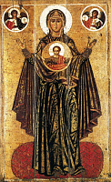 Кондаков указывает, что этот иконографический тип с изображением Богоматери с воздетыми руками и Предвечного Младенца в круге у Нее на груди имеет примеры в раннехристианском искусстве