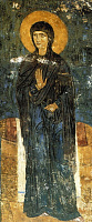 К этой же иконографической традиции относится и киевская икона второй половины XIII в. — Богоматерь Печерская (Свенская) с предстоящими преподобными Антонием и Феодосием. Находилась икона в Свенском монастыре недалеко от Брянска, где, по преданию, был в 1288 г. исцелен от слепоты черниговский князь Роман Михайлович, основавший в том месте обитель. То же предание говорит, что икона была принесена в новый монастырь из Киевского Успенского Печерского монастыря, где была написана в начале XII в. преподобным Алипием Печерским. Надо отметить, что Свенская икона является древнейшим изображением основоположников русского монашества. Текст на довольно хорошо сохранившемся свитке, который держит в руках преподобный Антоний, гласит: «Молю вас так, чада: держимся воздержания и не ленимся, имея в сем Господа помощником» [Древнерусское иск., с. 70–72].