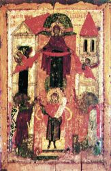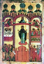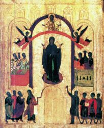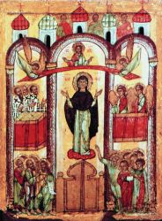 Дева днесь предстоит в церкви и с лики святых невидимо за ны молится Богу: Ангелы со архиереи поклоняются, апостоли же со пророки ликовствуют, нас бо ради молит Богородица превечнаго Бога. -(Кондак, глас