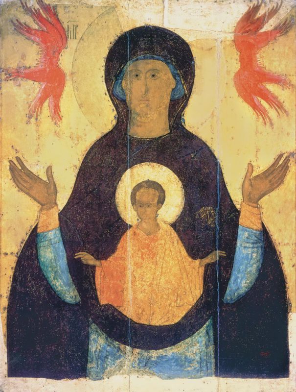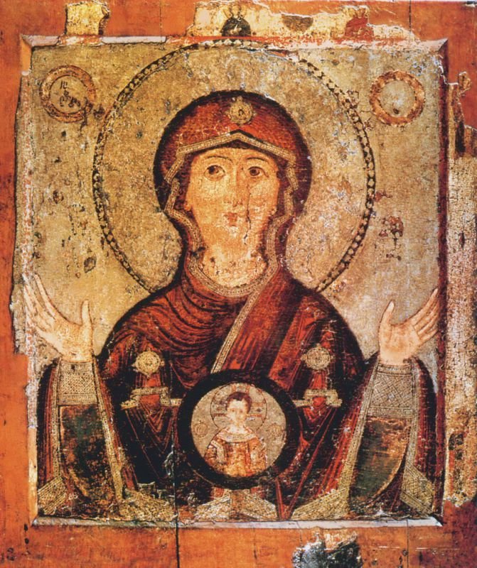 На Руси древнейшим памятником образа Божией Матери типа «Знамение» является икона из Софийского собора Новгорода. Первые летописные сведения о ней относятся к 1170 г.