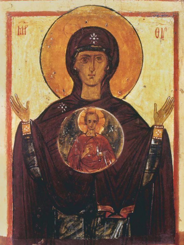 Одной из древнейших сохранившихся икон этого типа является византийский образ VI в. Богоматери Никопеи, находившийся в числе других почитаемых святынь во Влахернском храме Константинополя. На этой иконе Богоматерь держит изображение Христа перед грудью на круглом щите.