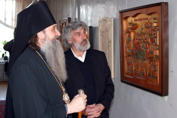 Затем Владыка Роман с духовенством проследовал в Ногинский музейно-выставочный центр, где совершил торжественное открытие выставки храмового искусства художников Подмосковья. Она организована московским областным отделением Союза художников России. В двух залах музея собраны православные иконы работы современных мастеров, выполненные в различных стилях и традициях. Владыка Роман поздравил организаторов и участников выставки с праздником, и призвал Божие благословение на их труды. Известный богородский художник Александр Хопкин тепло поблагодарил Владыку и познакомил его с экспозицией выставки.