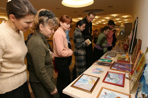 В фойе были развернуты выставки работ учащихся и книжное обозрение. Желающие имели возможность приобрести литературу, газеты и журналы.