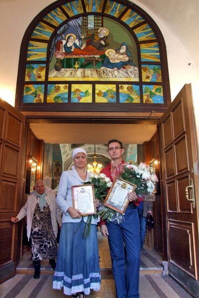 В феврале 2007 г. года был создан проект по изготовлению витража для собора Рождества Пресвятой Богородицы. Это был совместный проект фирм «Альф», выпускающей различные межкомнатные двери и перегородки, и «Стеклосфера», занимающейся изготовлением витражей. За работу взялись лучшие мастера руководители фирм А.Л. Рождественский и В.Н. Постникова. За полтора года их совместной работы они сначала стали сплоченным коллективом, а затем и дружной семьей. Их венчание состоялось 8 августа, накануне престольного праздника собора и освящения прекрасного витража.