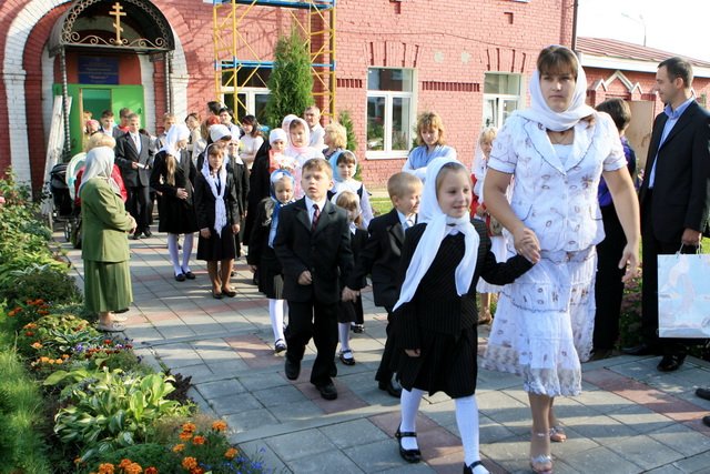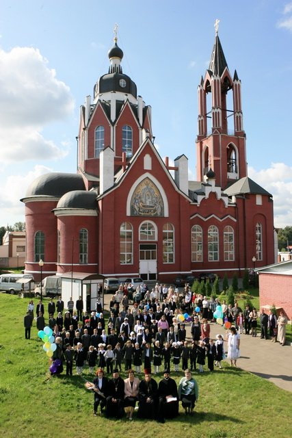 После молебна все собрались в актовом зале. Начался праздник — приветственное слово священника, выступления ребят, чествование первоклассников, фольклорное выступление гостей — народного ансамбля «Распевы» и, конечно, фотография на память с любимыми учителями и батюшками.
