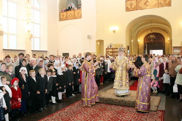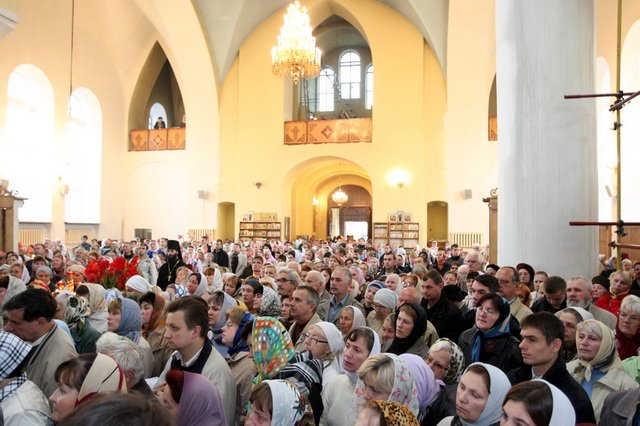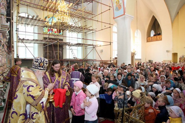 Я горячо и сердечно поздравляю всех вас, возлюбленные, с праздником. Рад, посещая этот великолепный храм, видеть, что никакие трудности не останавливают его возрождение и благоукрашение. Благодарю вас за заботу о храме Божием и надеюсь, что Господь за ваши лепты, за ваши жертвы, воздаст вам своими Небесными дарованиями. Причастников и причастниц я поздравляю с принятием Святых Христовых Таин, желаю вам помощи Божией во всем и призываю на вас Божие благословение».