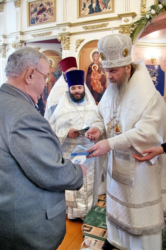 По окончании богослужения архиепископ Григорий поздравил молящихся с великим торжеством, передал благословение митрополита Ювеналия, а затем вручил церковные награды: настоятелю храма священнику Михаилу Лытькову — орден прп. Сергия Радонежского III степени, попечителю храма Л. Т. Захаренко — орден св. блгв. кн. Даниила Московского II степени, директору Яковлевского филиала ФГУП «Мослес» Н. Н. Косолапову — медаль св. блгв. кн. Даниила Московского, генеральному директору ООО «Технопроектсервис» В. В. Винокурову — патриаршую грамоту. Благословенные митрополичьи грамоты были вручены: директору Щетиновской средней школы А. В. Луканину, главе сельского поселения Белавинское Т. Н. Горячевой, попечителю храма А. Д. Зимину, инженер-эксперту ООО «Юмакс» А. С. Кустову, директору детского сада «Берёзка» Т. И. Минеевой, певчей храма Н. А. Захарченковой, сотрудникам храма Д. Е. Новосёлову и Е. Ю. Базаркиной.